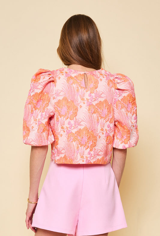 Emily jacquard orange and pink puff sleeve top