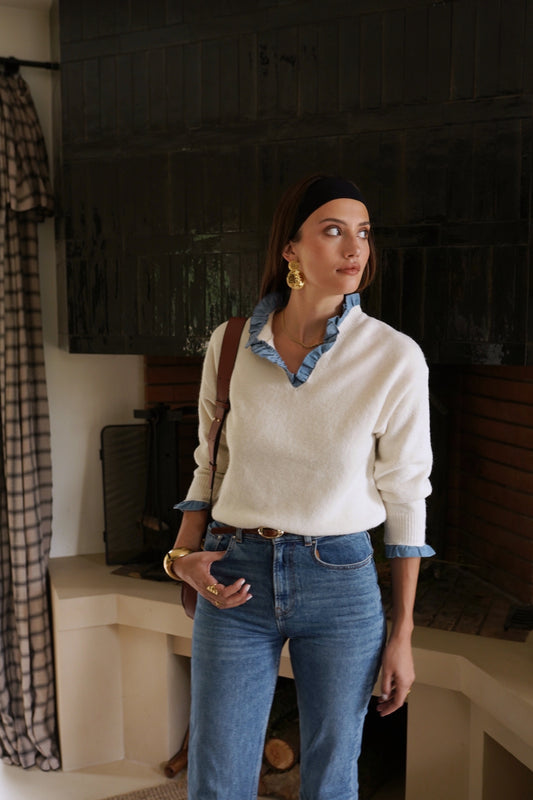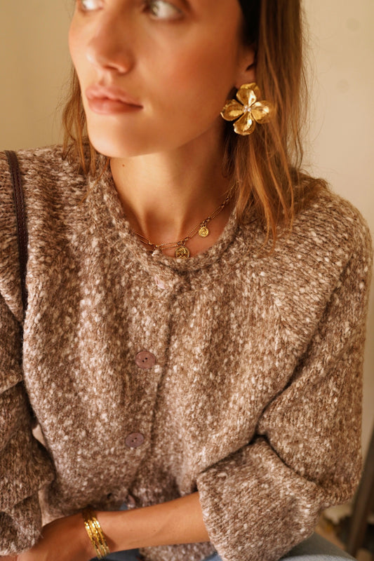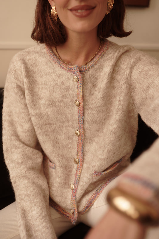 Lauren taupe fluffy jumper with sleeve gold buttons
