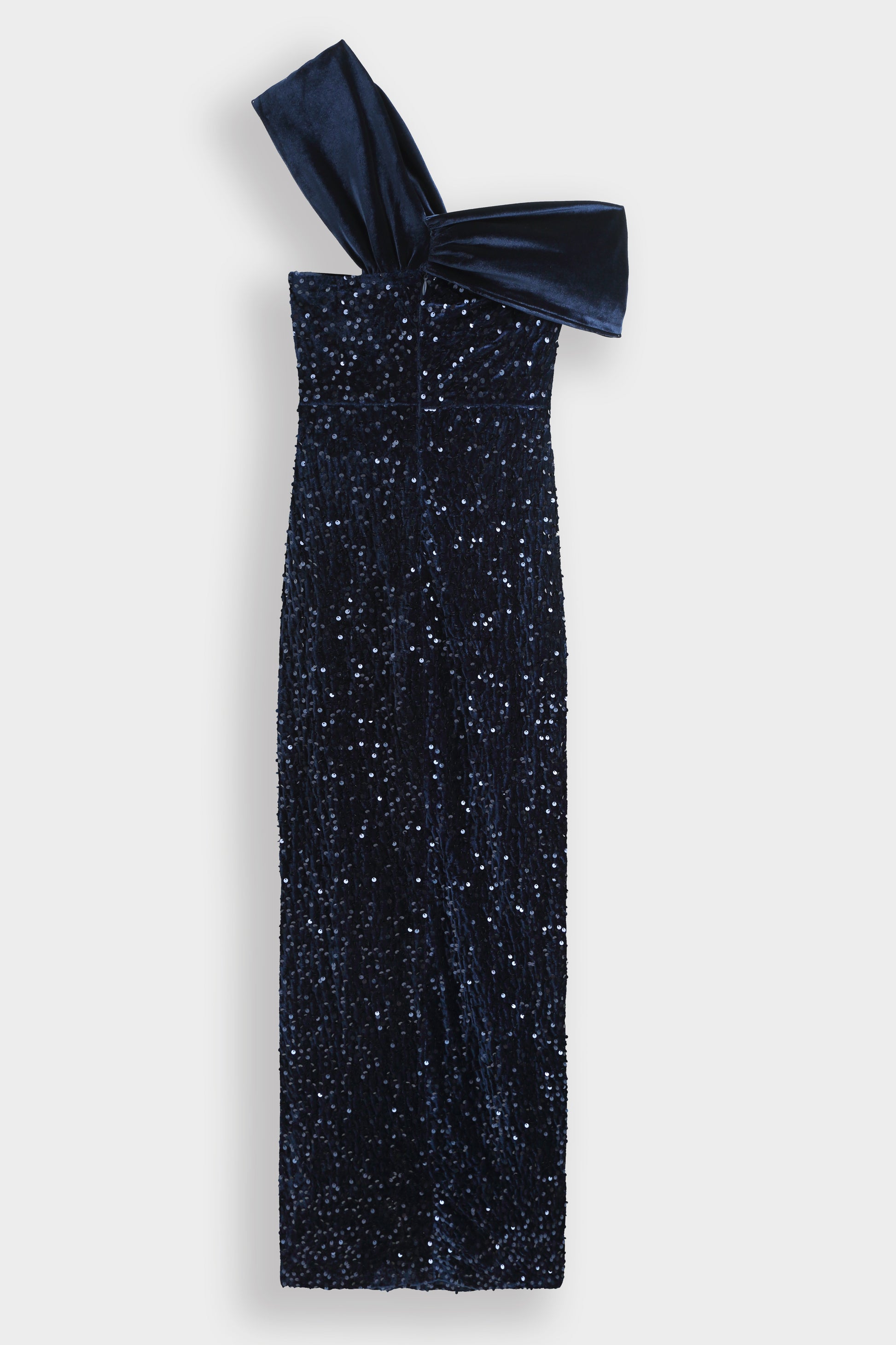This navy velvet dress features stunning sequin accents and drop shoulder design, perfect for turning heads at any winter wedding or event. Elevate your style while staying warm and comfortable. Add a touch of glamour to your wardrobe with this chic and sophisticated dress.