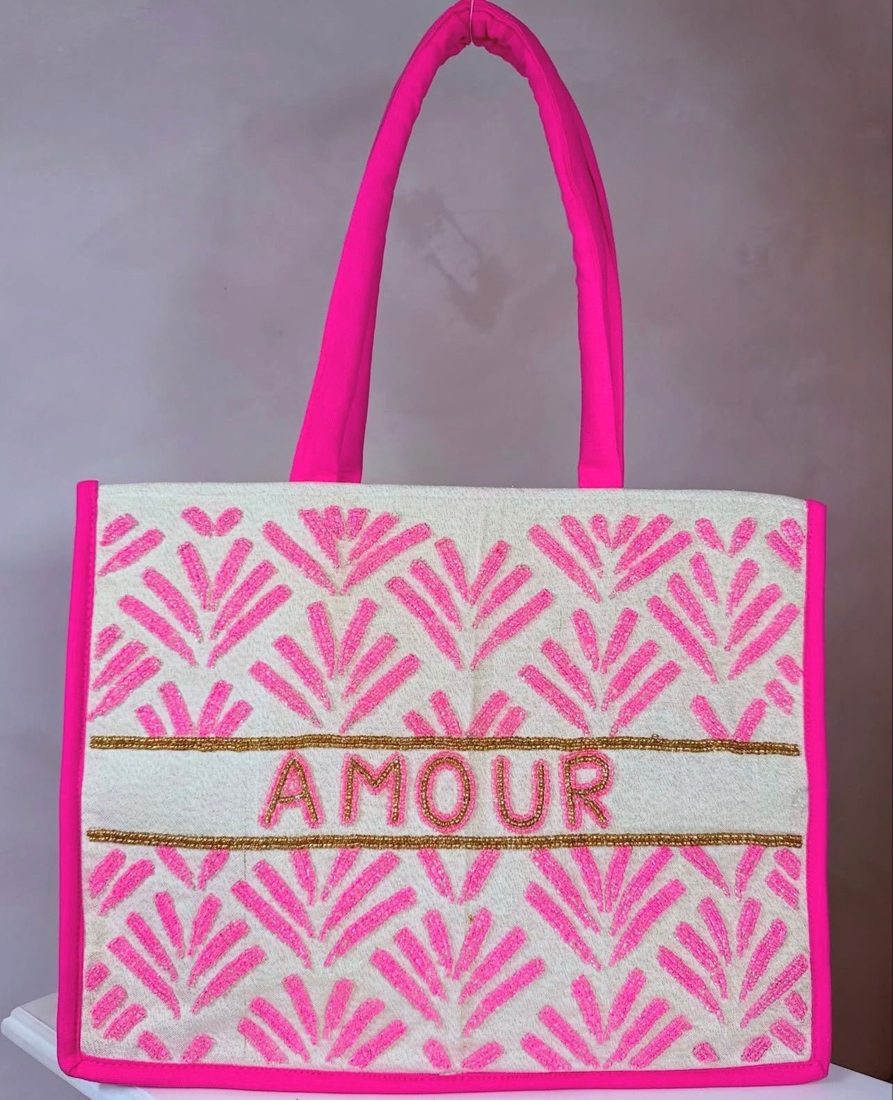 Introducing the Amour nein pink beaded bag, perfect for those with a boho style. This unique bag is expertly crafted with intricate beadwork, adding a touch of elegance to any outfit. With its versatile design, it's a must-have accessory for any fashion-forward individual.