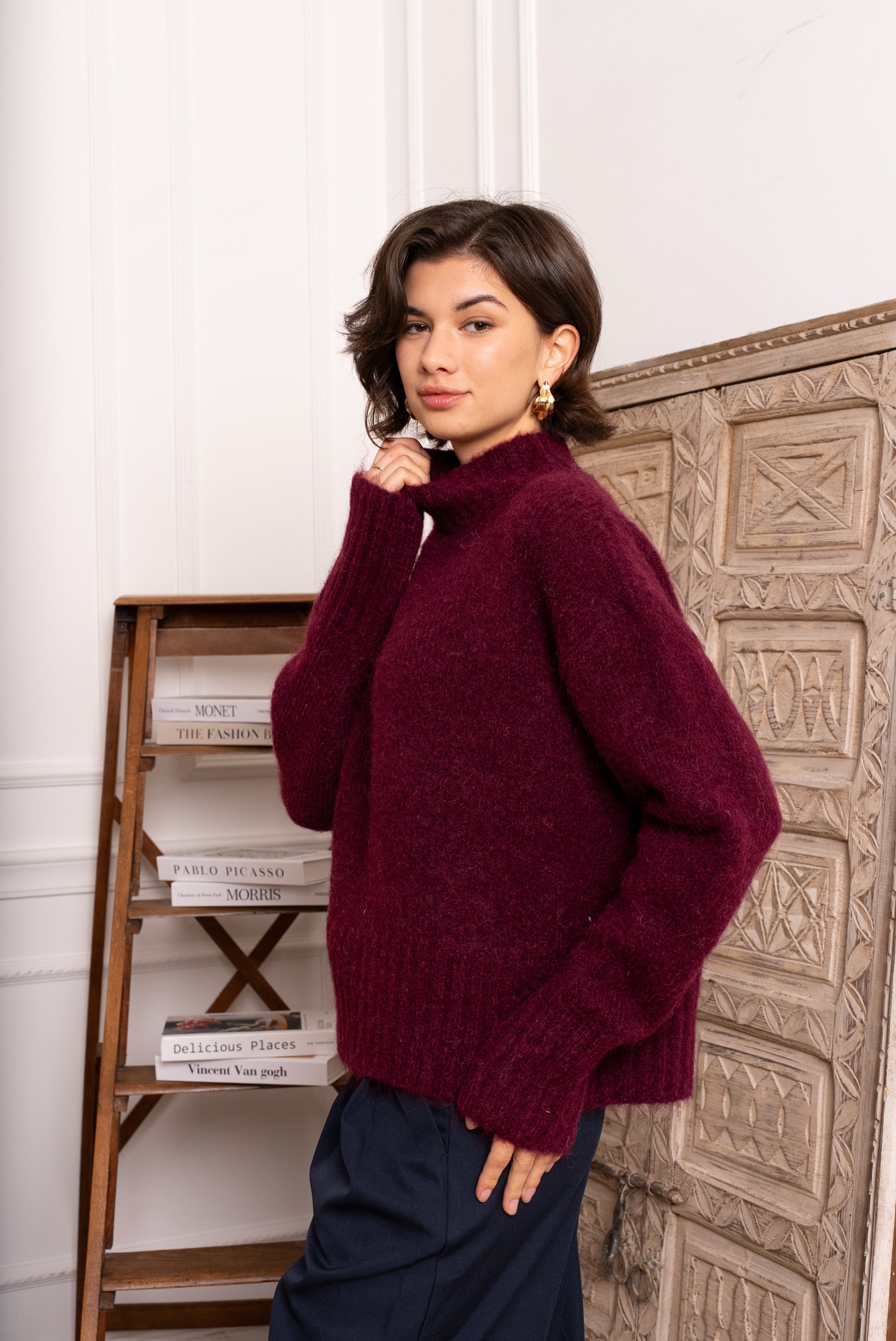 This Audrey burgundy soft polo neck jumper is the perfect addition to your winter wardrobe. Made with a super cosy fabric, it will keep you warm and comfortable all season long. Pair it with a skirt and boots for a stylish and practical look.