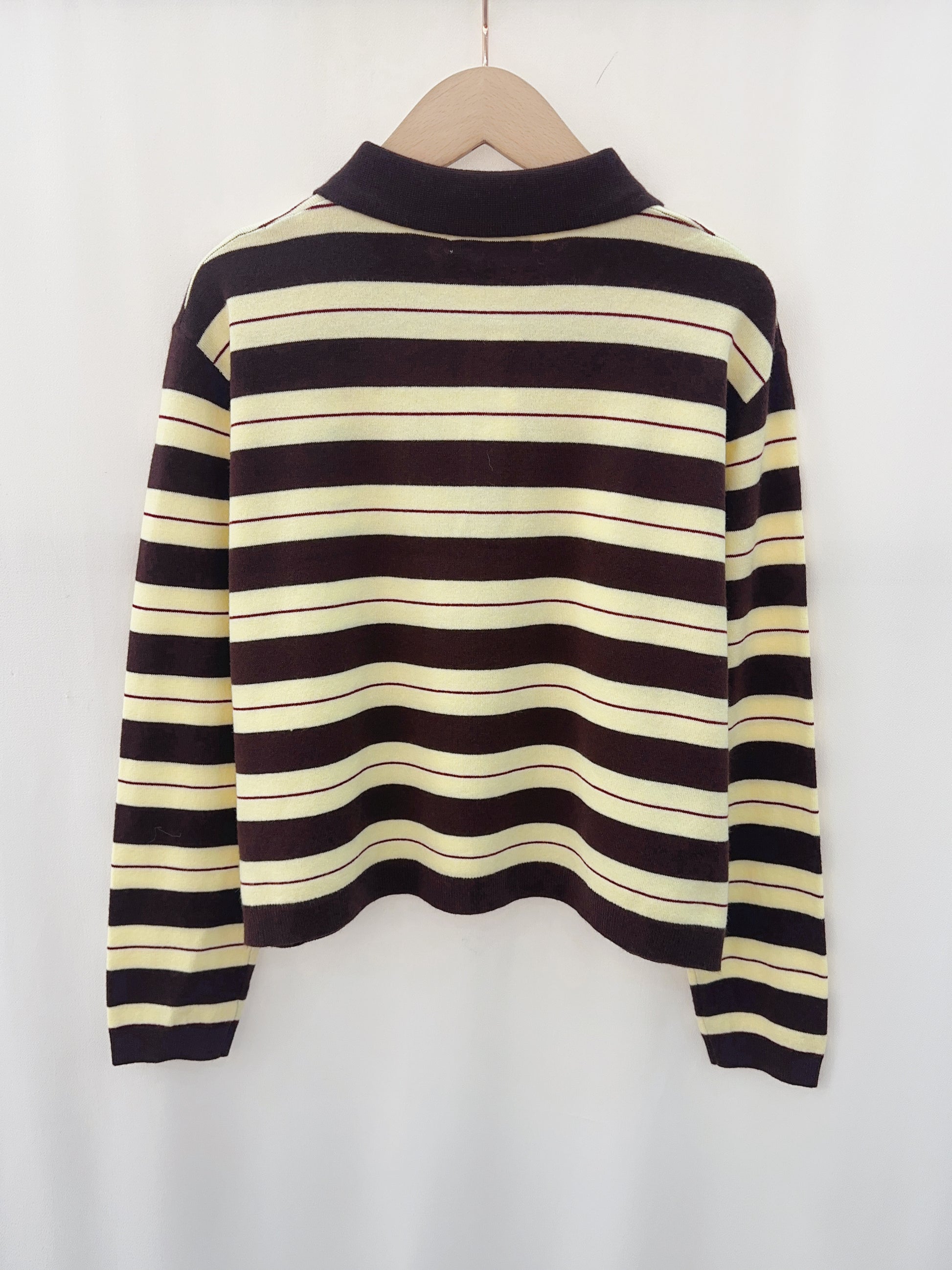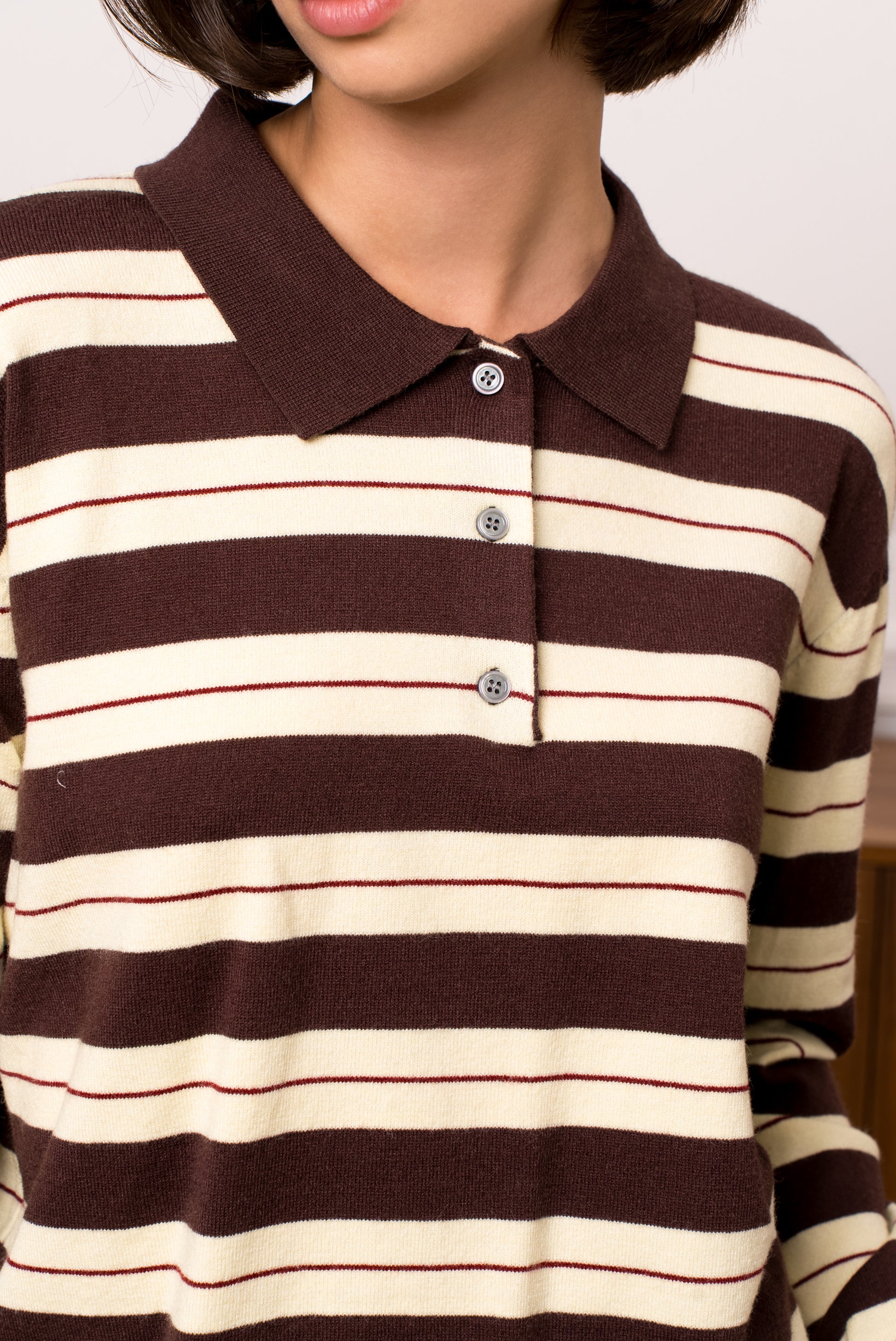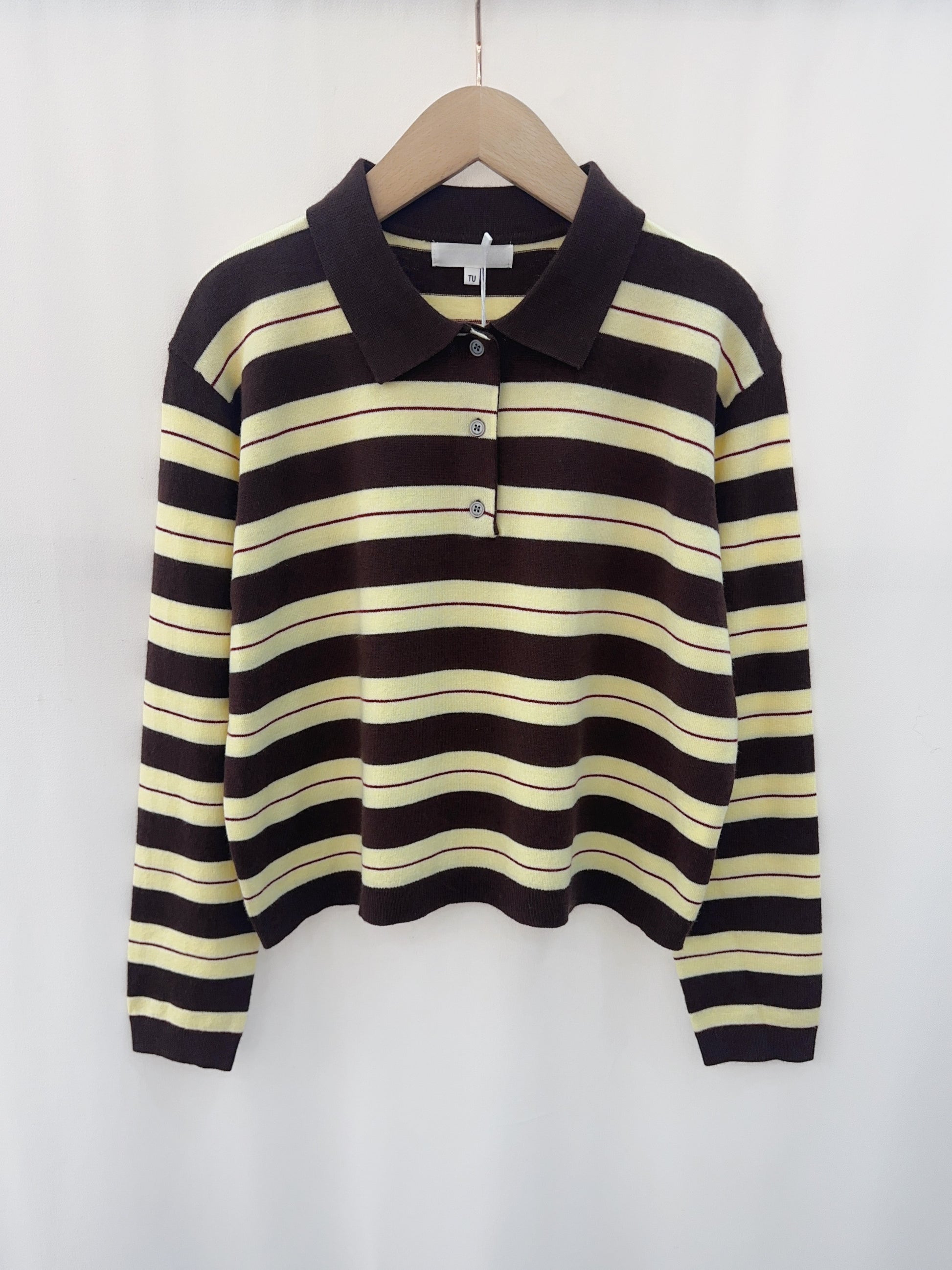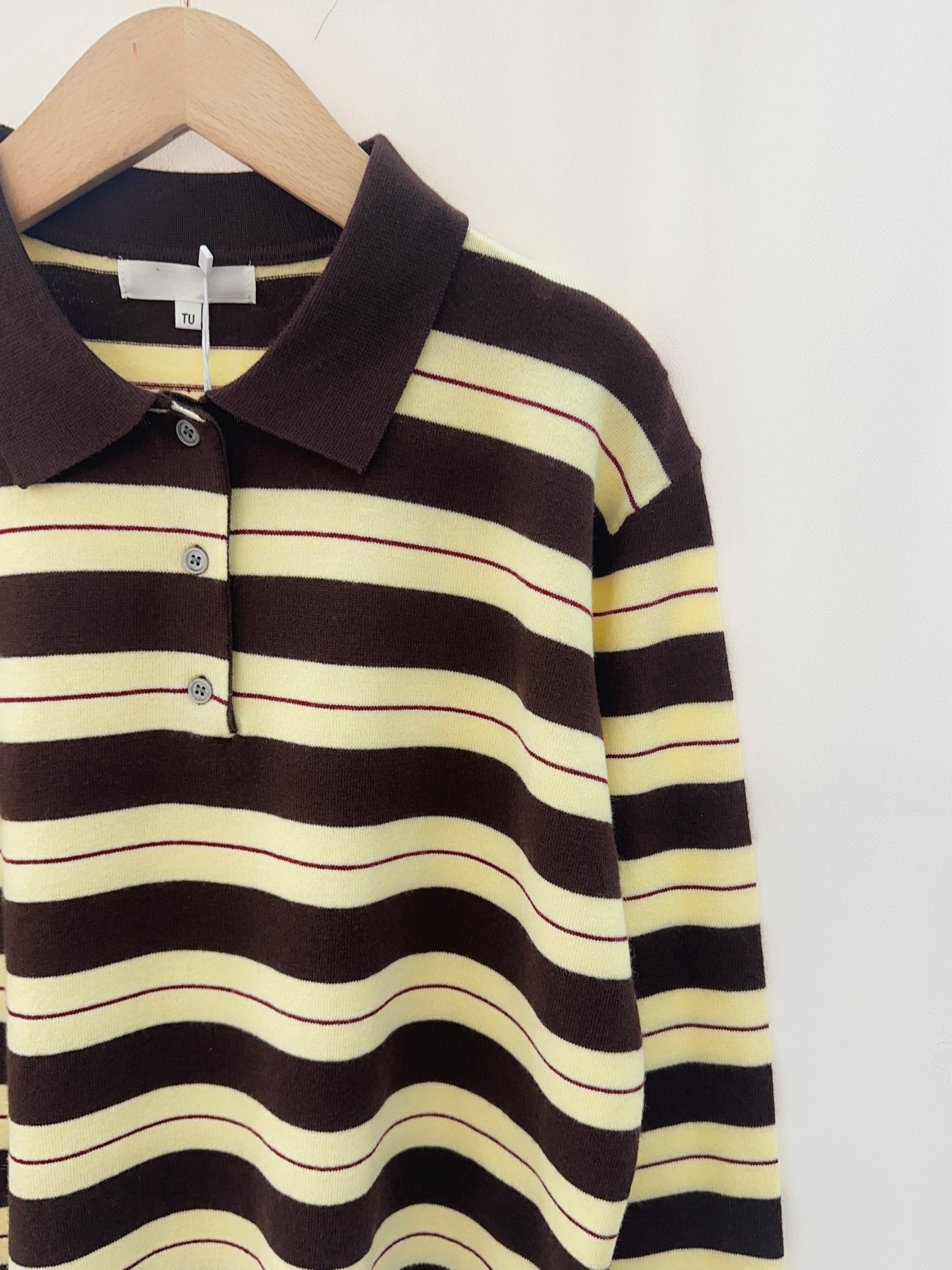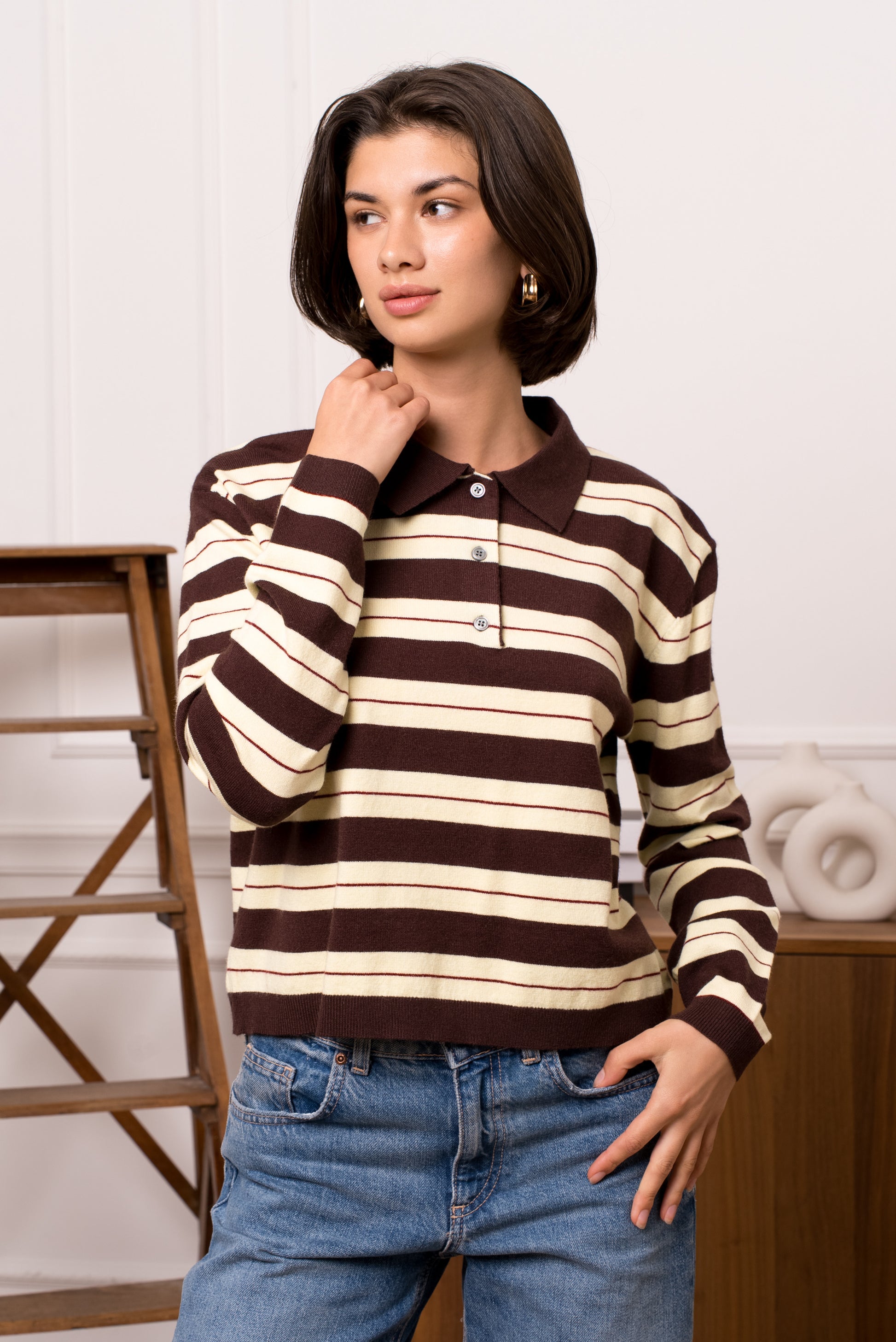 The Beth brown striped knit polo top is the perfect blend of style and comfort. Featuring a trendy rugby polo design, this top is a must-have for any fashion-forward wardrobe. Made with soft and durable materials, it offers both functionality and fashion in one versatile piece. Upgrade your wardrobe with Beth!