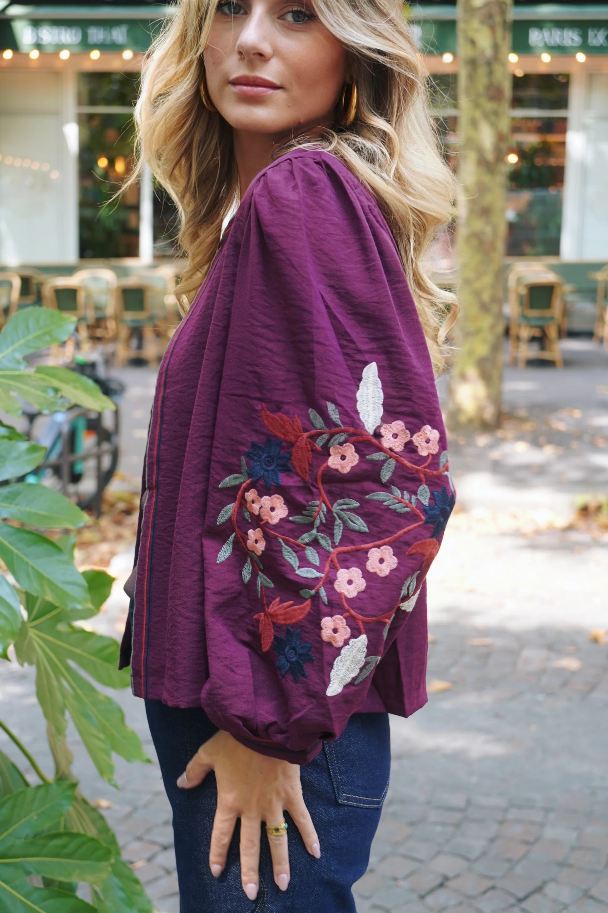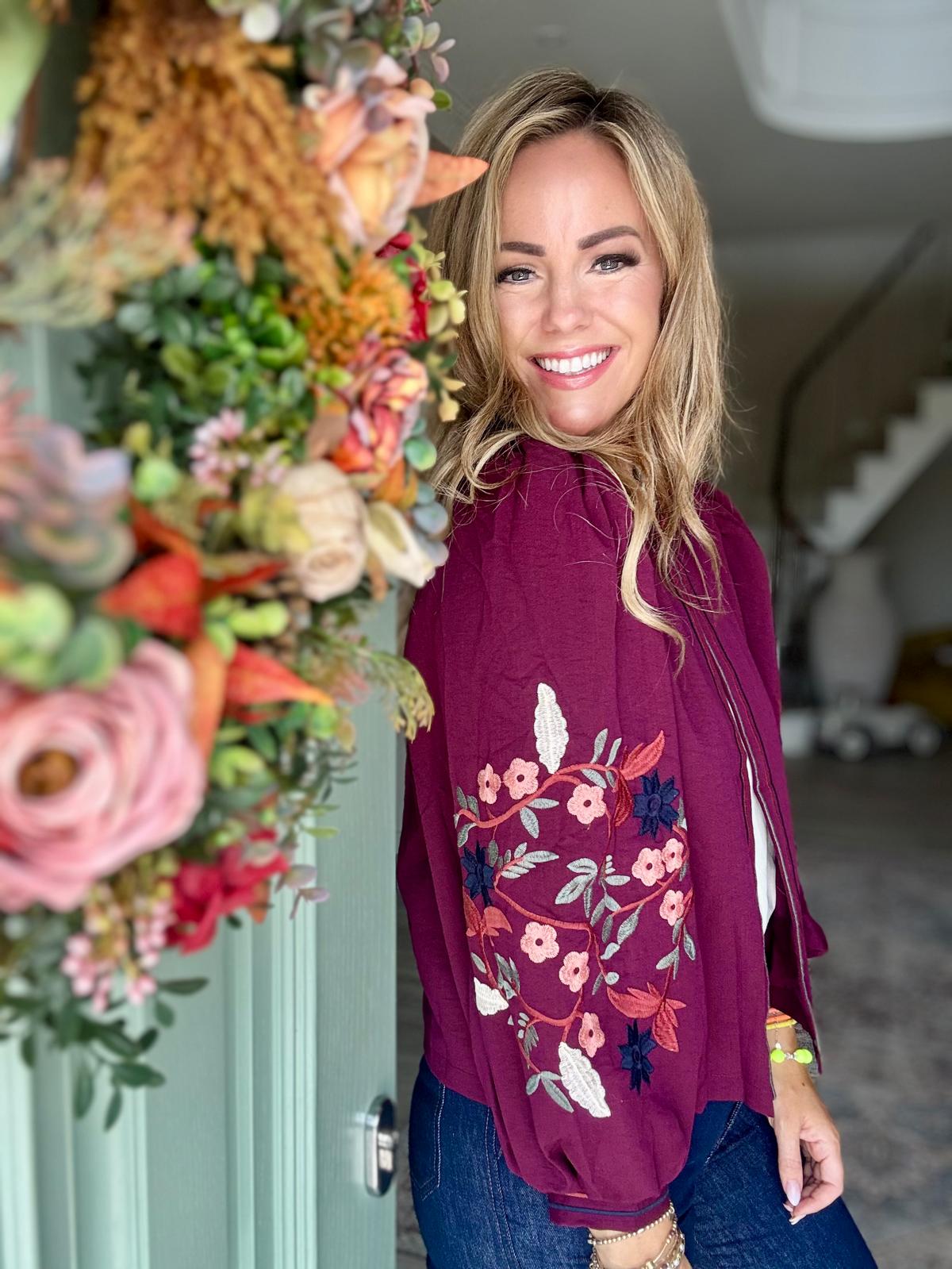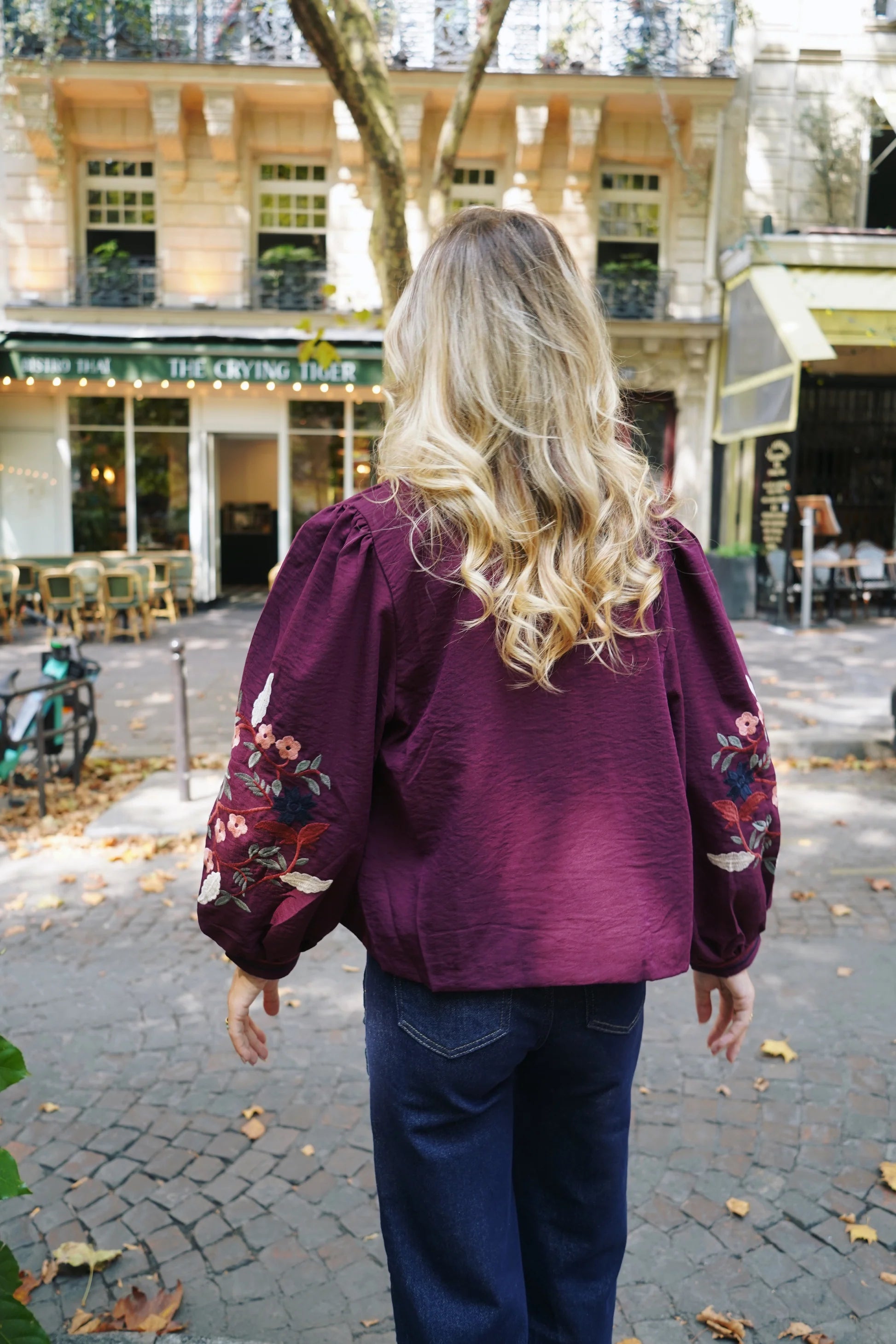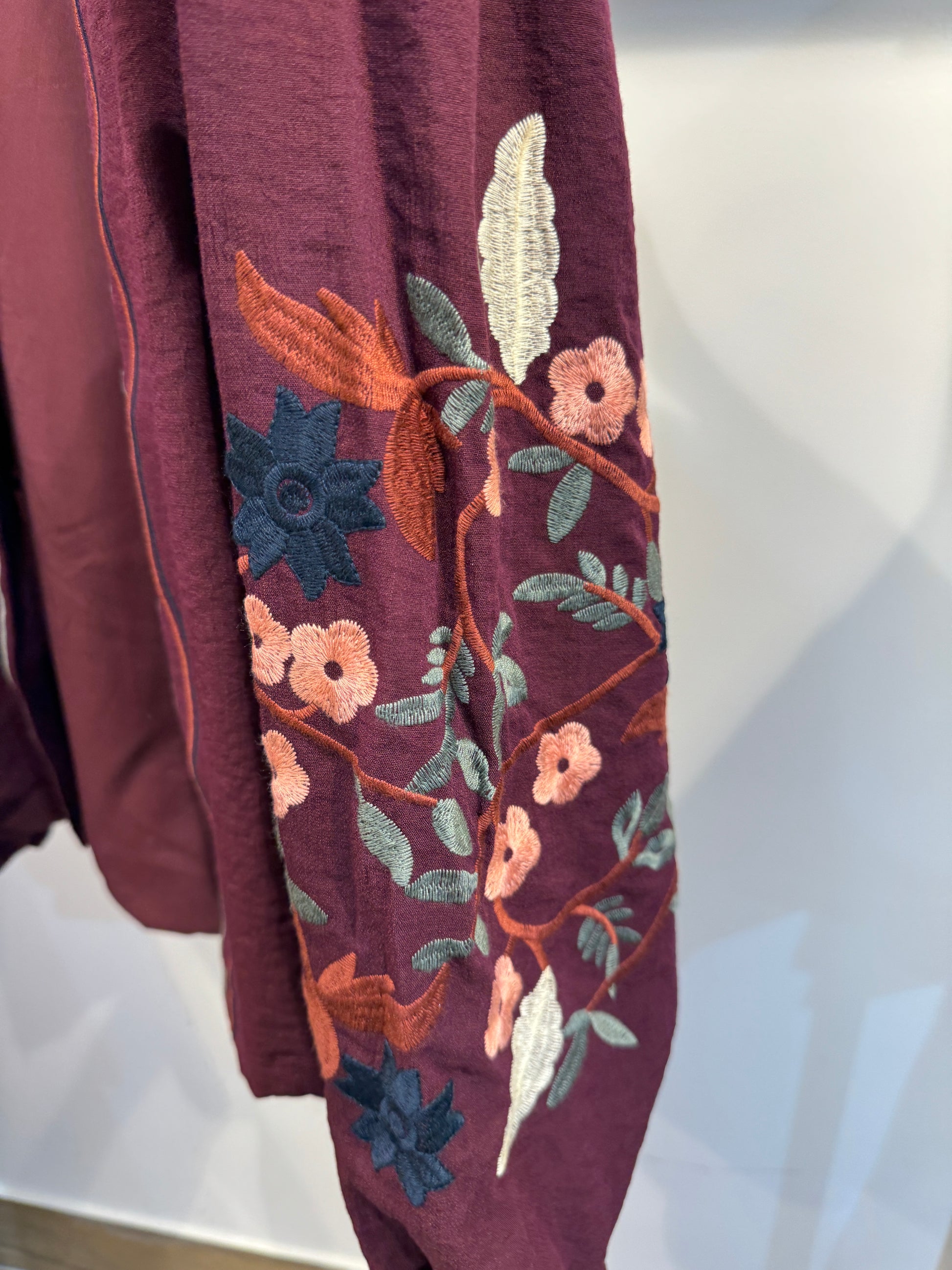 Accentuate your boho style with the Cecilia burgundy floral jacket. Its embroidered balloon sleeves add a touch of whimsy and charm to any outfit. Made with quality materials, this jacket is both stylish and durable. Elevate your wardrobe and stand out with this unique piece.