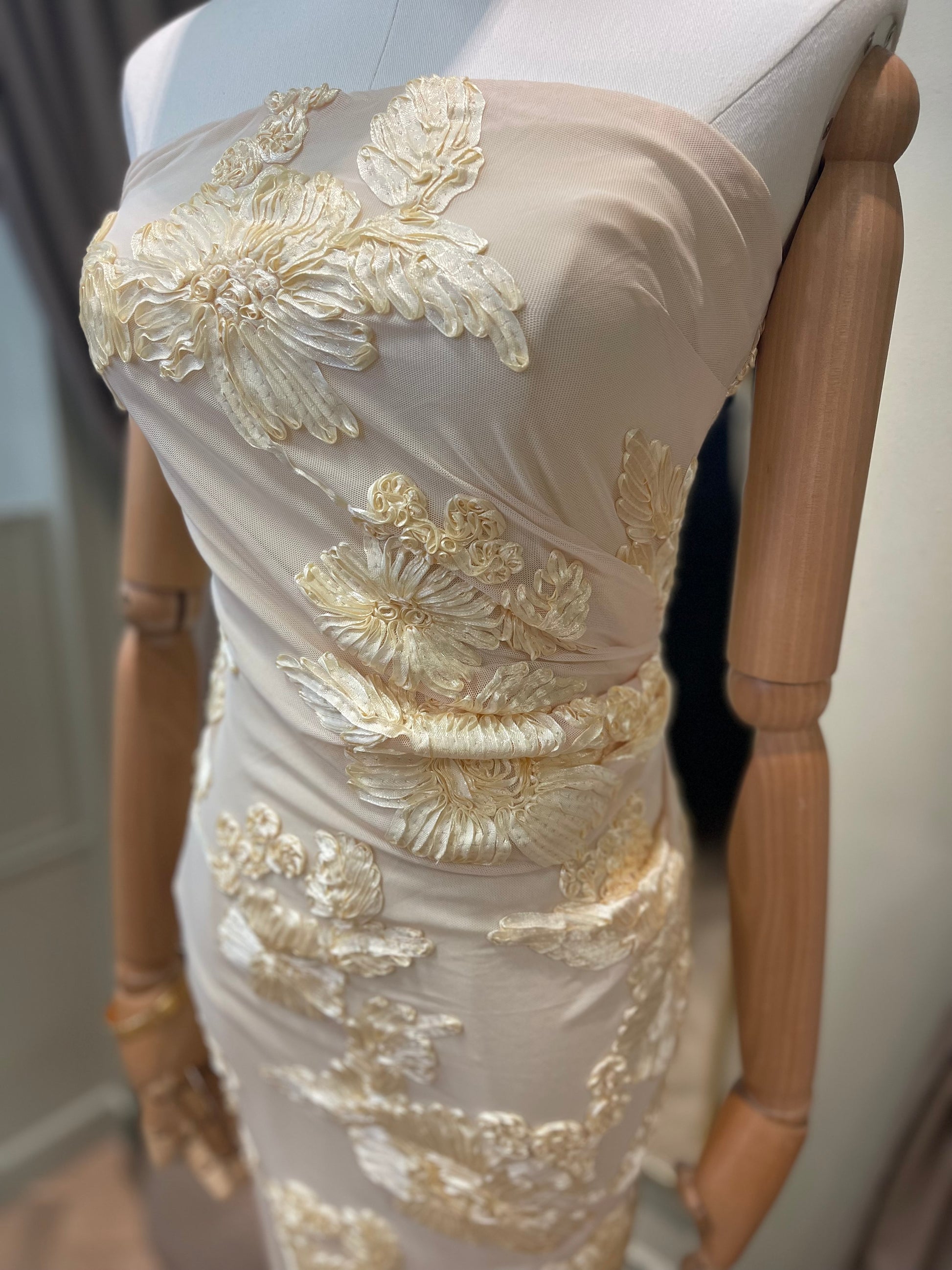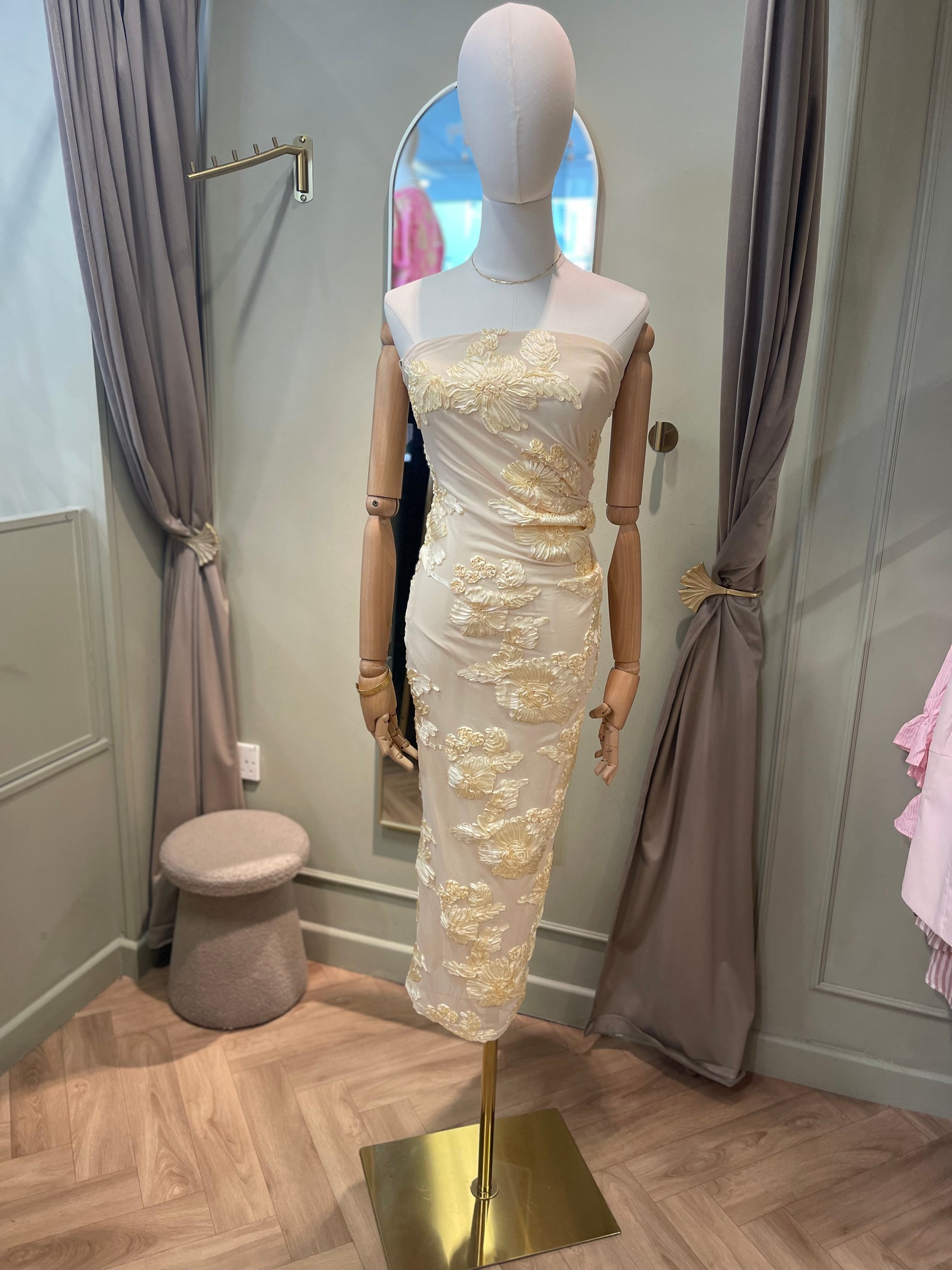 Elevate your wardrobe with the Eleanor floral strapless embroidery butter yellow dress, a refined choice for sophisticated occasions. Crafted with delicate floral embroidery, this strapless design highlights your neckline and shoulders with elegance. The soft pink hue adds a romantic touch, while the tailored fit ensures a flattering silhouette. Perfect for garden parties, weddings, or upscale events, this dress combines timeless femininity with expert craftsmanship for a standout look.