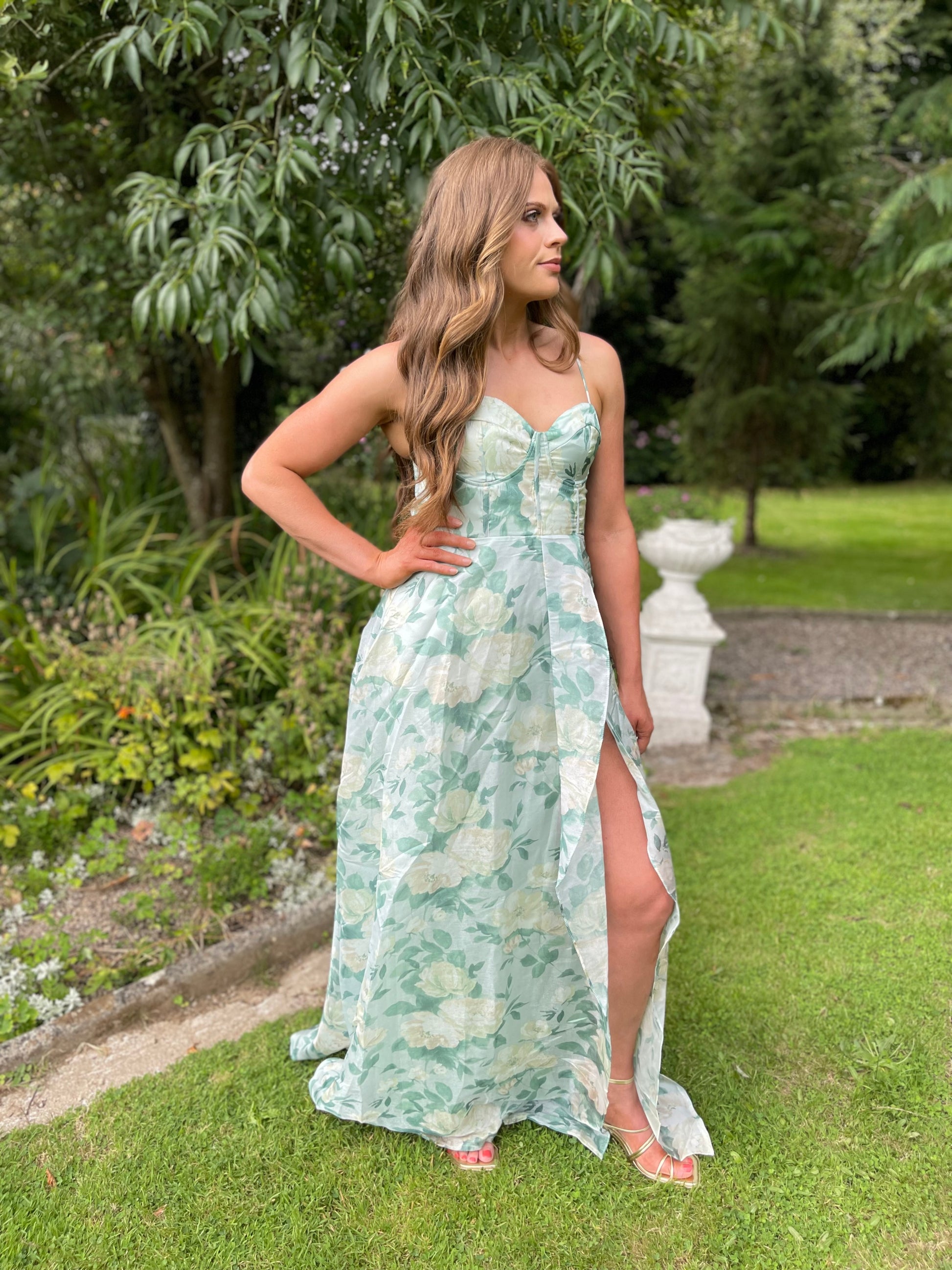 Elevate your style with our Charlotte mint floral long bustier dress. With a princess-like silhouette and flowing design, this dress will make you feel like royalty. The slit up front adds a touch of elegance, while the slightly padded cups provide comfortable support. Perfect for any formal occasion.