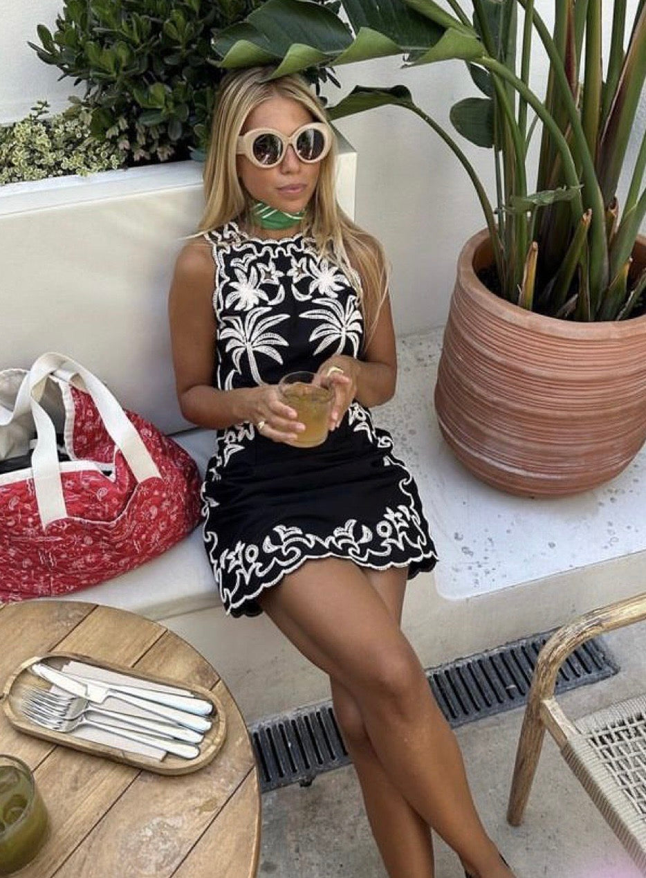 Expertly crafted with a blend of 55% cotton and 45% linen, the Chloe Palm Tree Embroidered Dress is a stylish and comfortable option. Its black and white color scheme adds a touch of sophistication, making it perfect for any occasion.