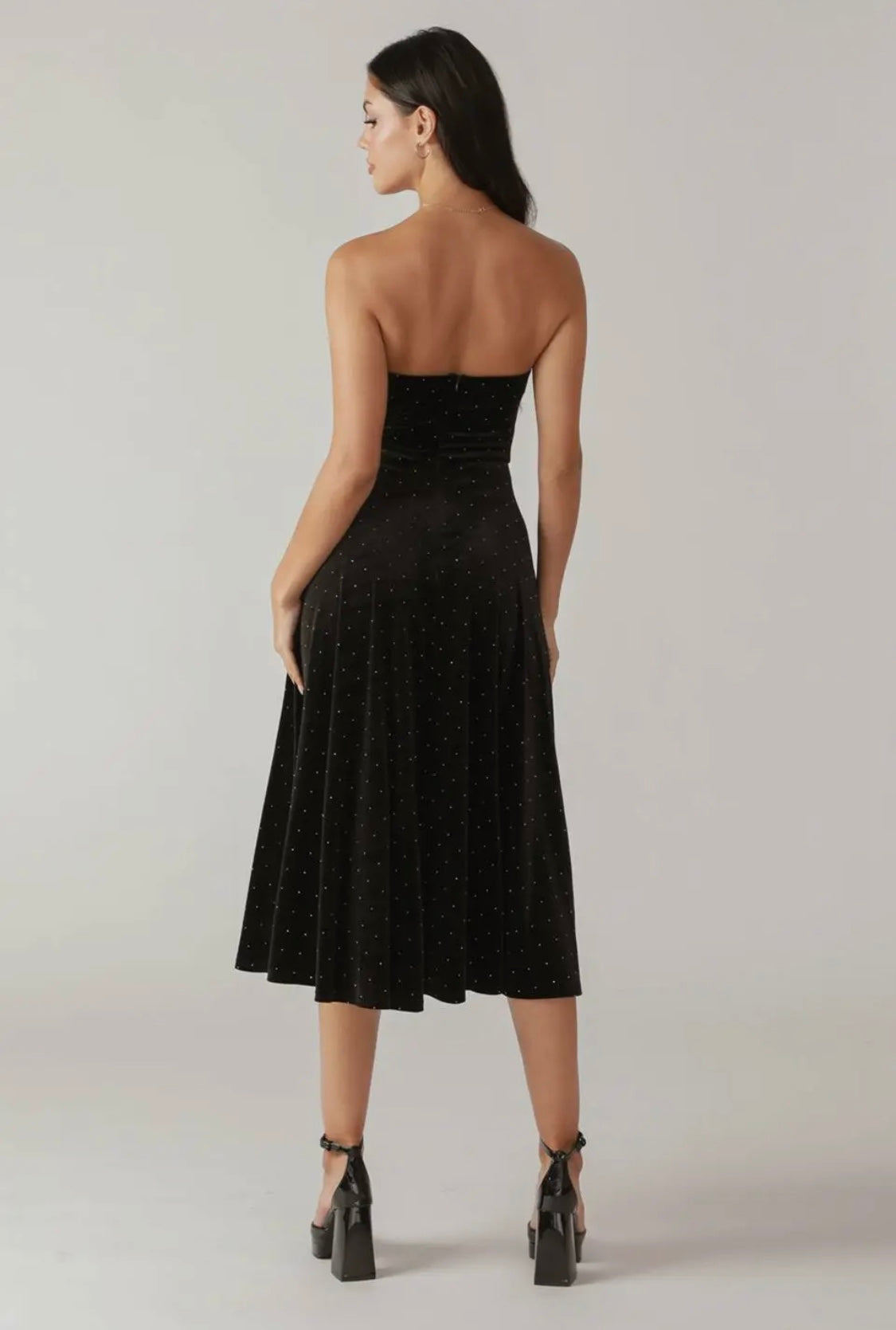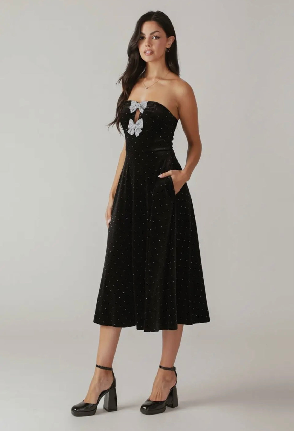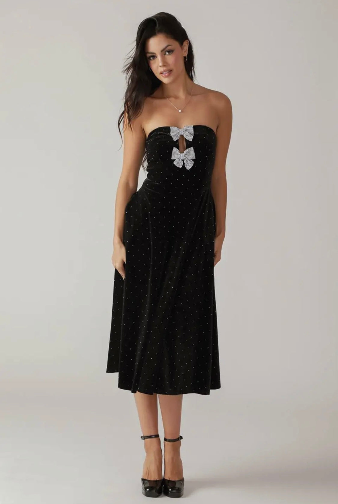 An embellished velvet midi dress featuring strapless, front bow trim, A line skirt and back zipper closure Details: Self: 95% Polyester 5% Spandex Lining : 100% Polyester Size & Fit - Model is 5`8" And Wearing Size Small - Measurements Taken From Size Small - Approx. Length: 43"