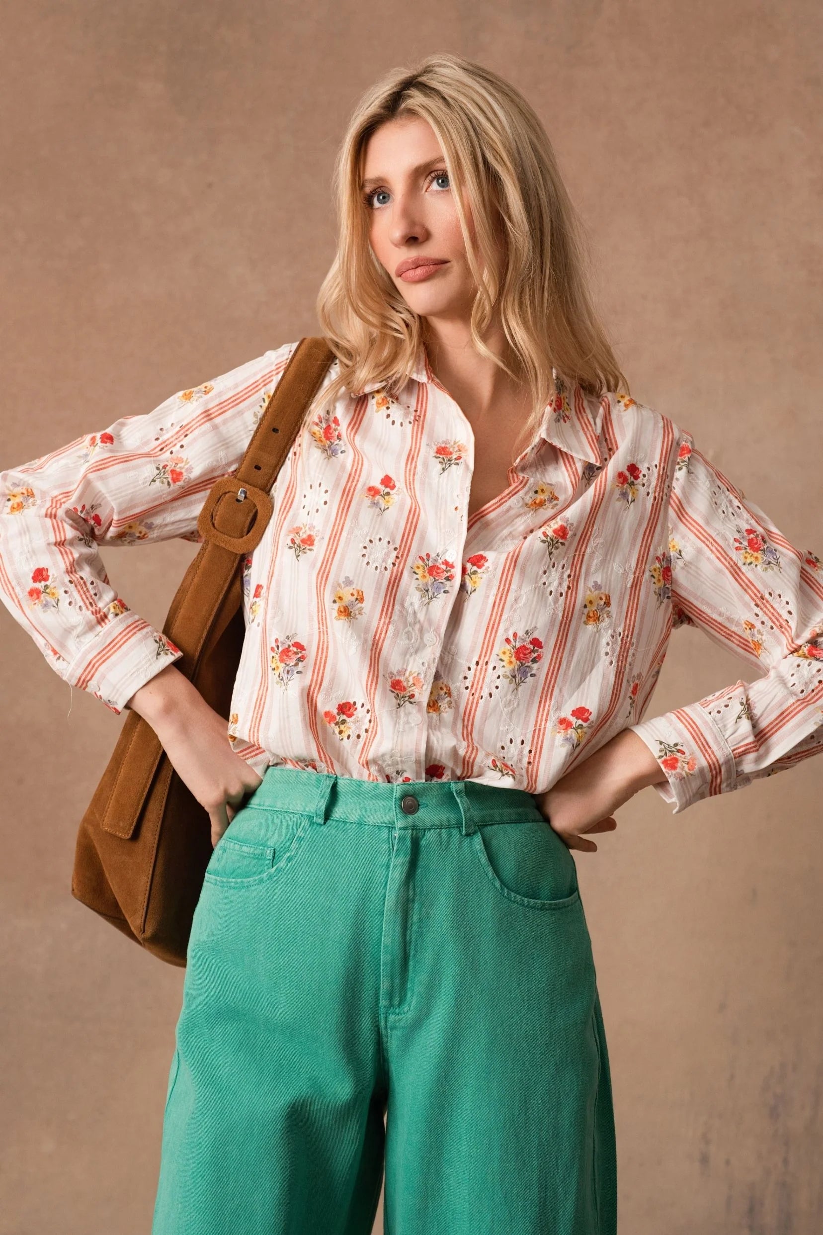 Crafted from 100% cotton, this Delphine shirt combines breathable comfort with refined style. The vibrant orange base provides a striking canvas for delicate floral embroidery that adds sophisticated detail without overwhelming the design. Perfect for layering or wearing standalone, the natural fabric ensures all-day wearability while the intricate needlework elevates any casual or smart-casual ensemble. A versatile piece that transitions effortlessly from season to season.