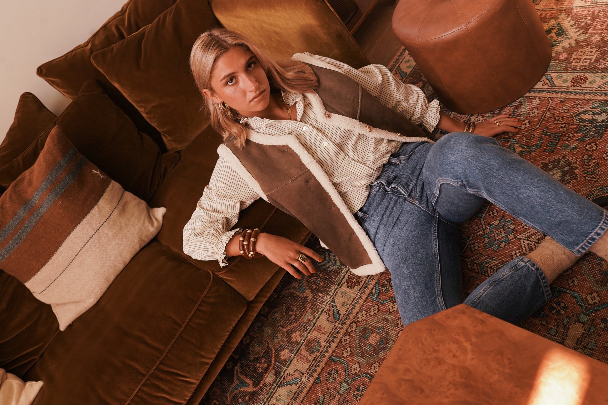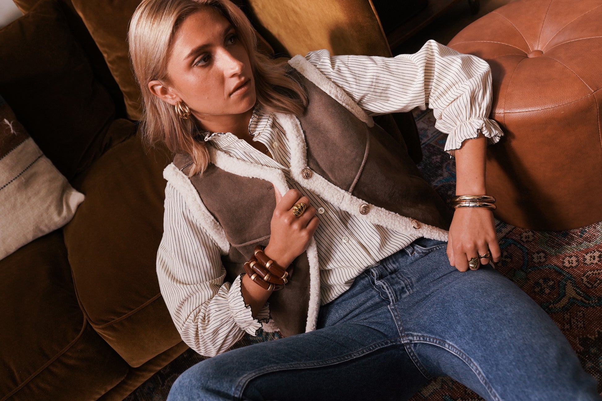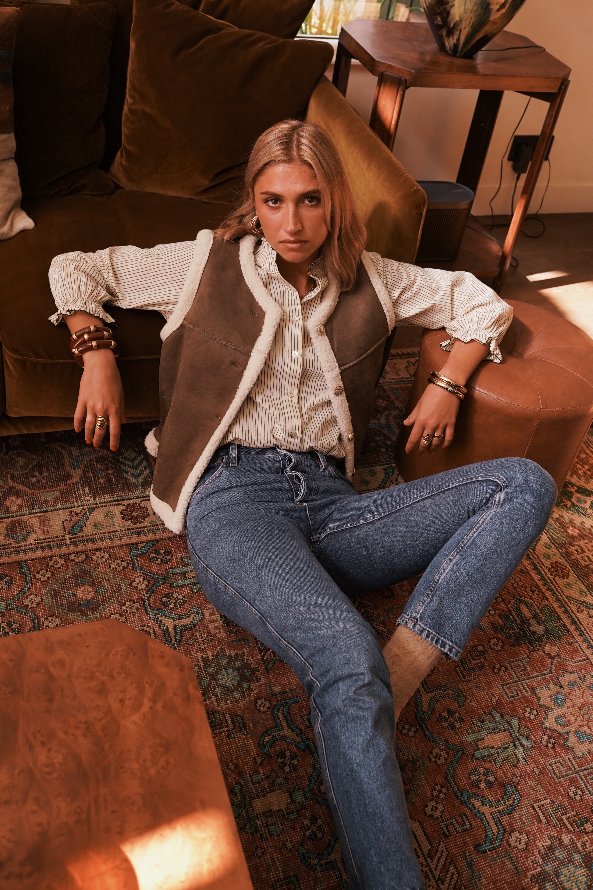 This Dotty shearling trim gilet features a stylish brown design with beige shearling accents and gold buttons. Crafted with high-quality materials, it offers both warmth and style for any outfit. Upgrade your wardrobe with this luxurious and versatile gilet.