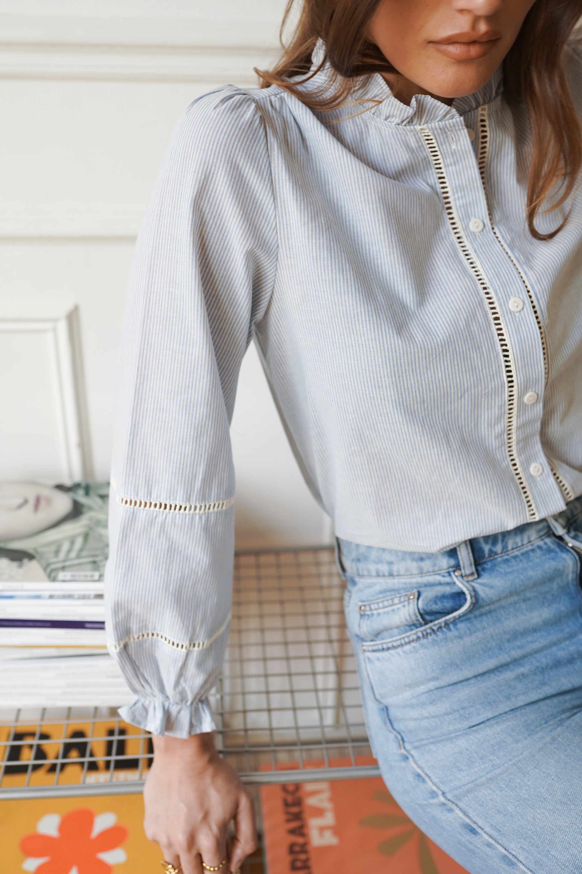The Erica blue striped ruffle trim collar blouse is crafted from 100% cotton, ensuring breathability and comfort. Available in sizes S/M (8-10) and M/L (12-14), this blouse combines a structured design with delicate ruffle detailing, making it suitable for both casual and formal occasions.