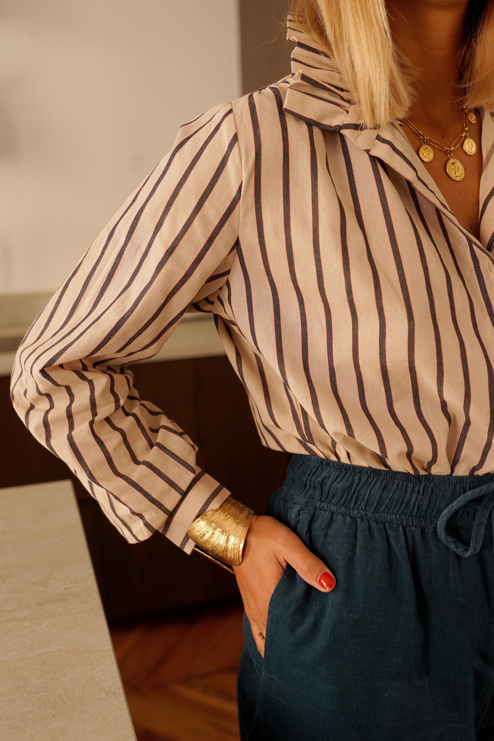 Introducing the Felicity taupe stripe frill neck blouse. Made from 100% cotton, this blouse exudes French chic style. The frill neck adds a touch of elegance and can be layered under a jumper for a sophisticated look. Elevate your wardrobe with this versatile and stylish blouse.