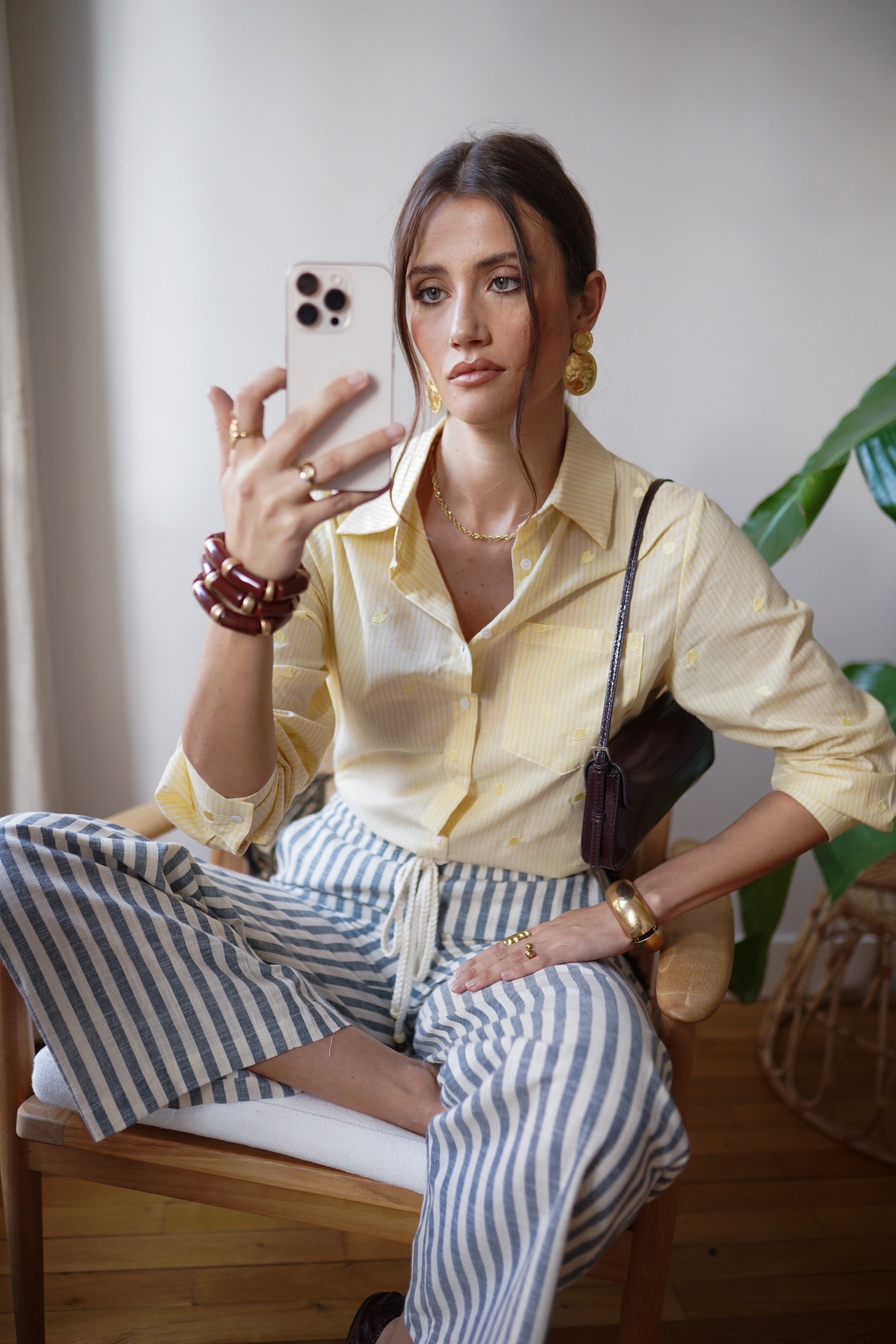 Expertly crafted with 100% cotton, the Hannah yellow striped heart print shirt offers a comfortable and breathable option for your wardrobe. Embrace effortless style and quality materials with this must-have piece.