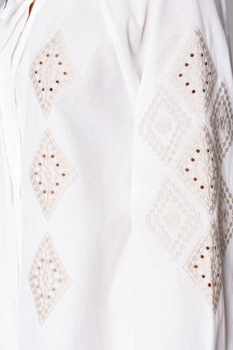 Crafted from 100% cotton, the Harper blouse boasts a contemporary chevron embroidery that adds texture and dimension to any outfit. With its soft and breathable fabric, this blouse is both comfortable and stylish, making it a versatile addition to any wardrobe.