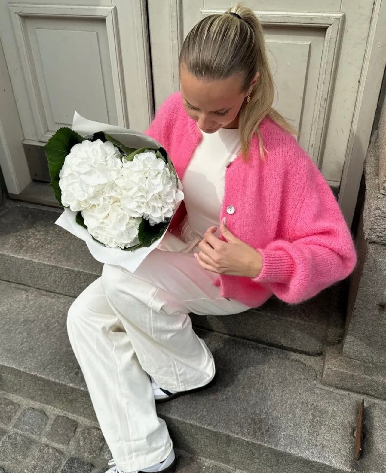 The Harriet purple cardigan, designed to fit sizes 8-14, combines 30% superfine alpaca with other fibers for enhanced durability and softness. This blend provides warmth while maintaining breathability, making it suitable for various climates. The use of polyamide and acrylic ensures longevity in wear, while the elastane offers slight stretch for comfort.