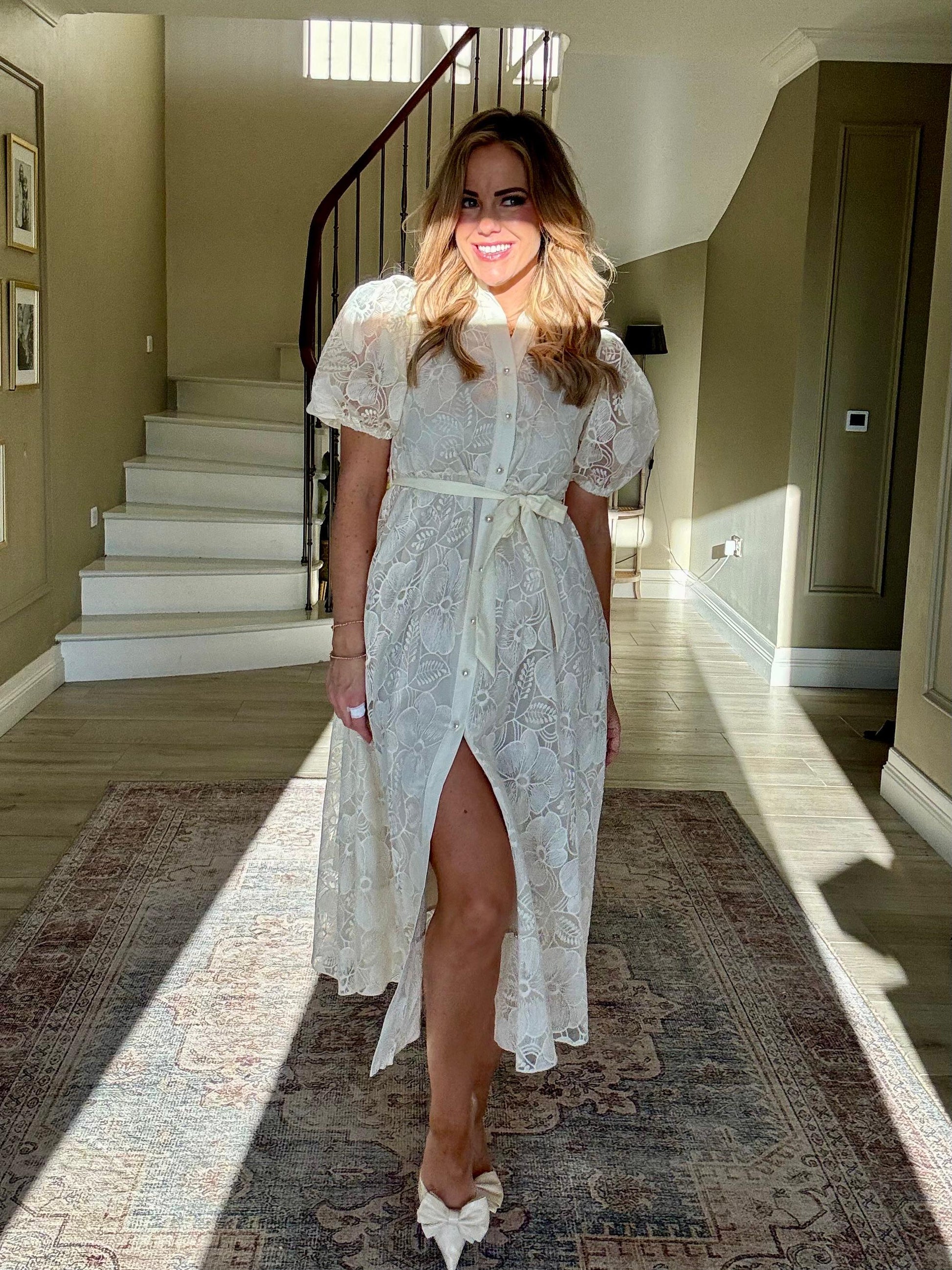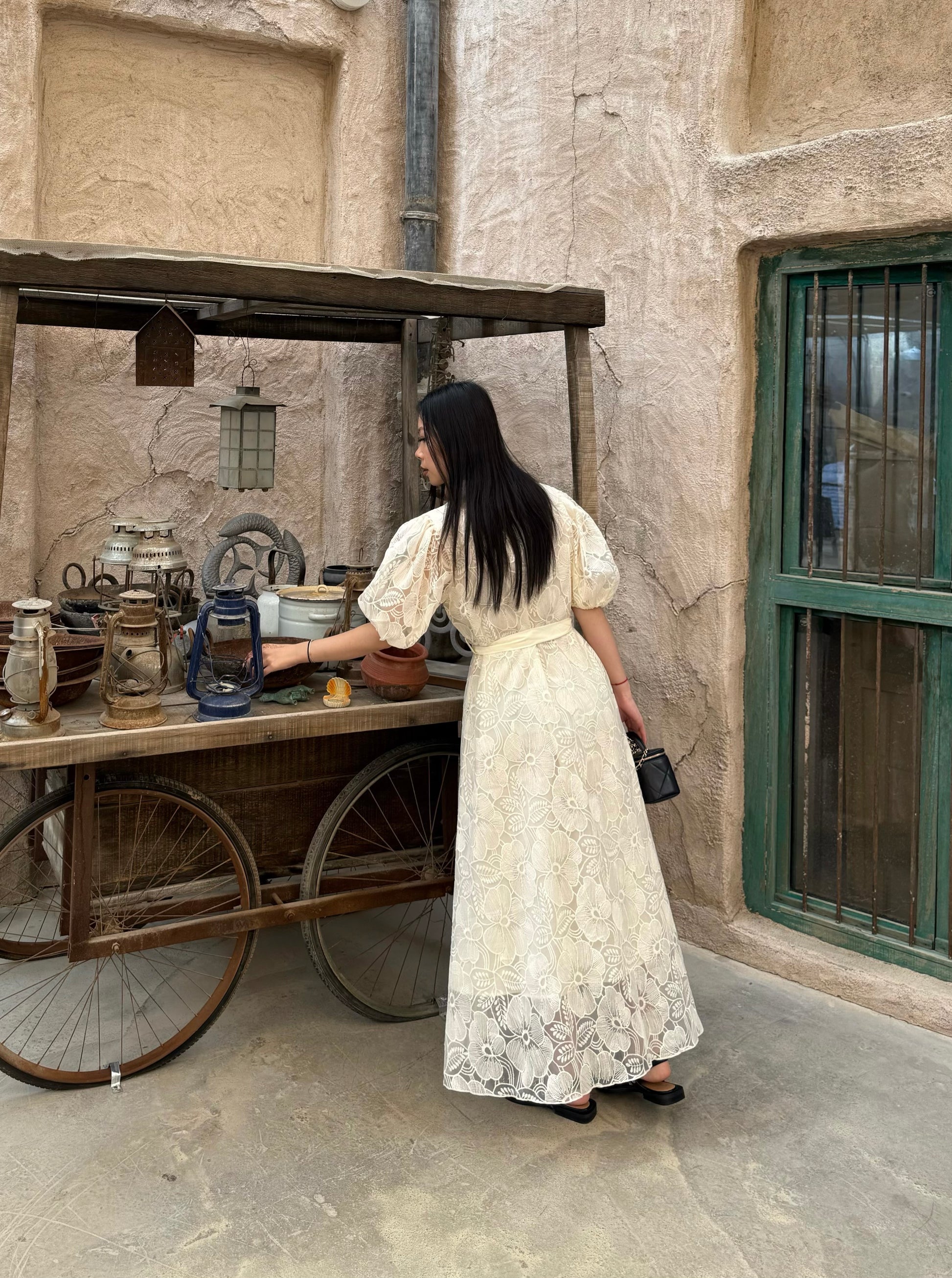 The Iris butter yellow lace dress features puff sleeves and pearl buttons, aligning classic design with modern elegance. The maxi length offers versatility suitable for various occasions. The lace fabric enhances breathability, providing comfort while maintaining a sophisticated appearance, ideal for formal gatherings or summer events.