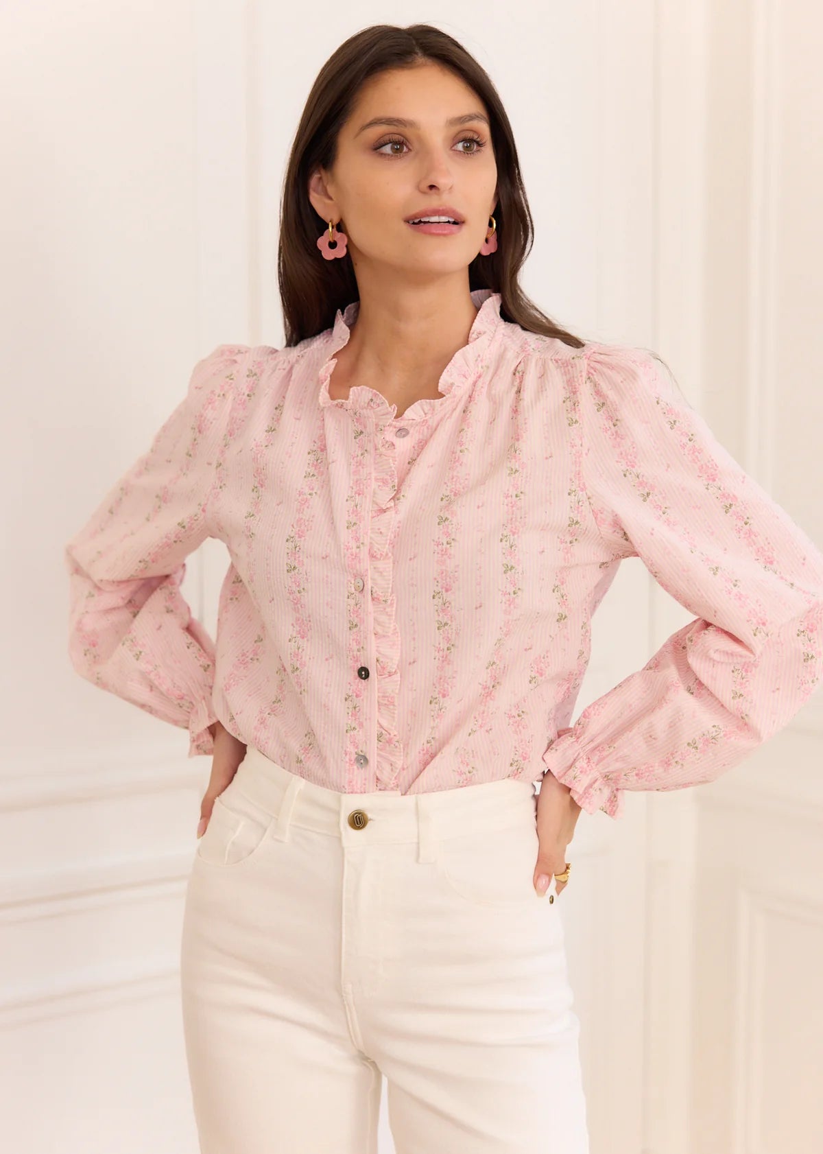 The Lara pink floral blouse is crafted from 100% cotton, offering breathability and comfort. This natural fiber is known for its softness against the skin and its ability to absorb moisture, making it suitable for both casual and formal occasions. With its floral design, it enhances visual appeal while maintaining durability.