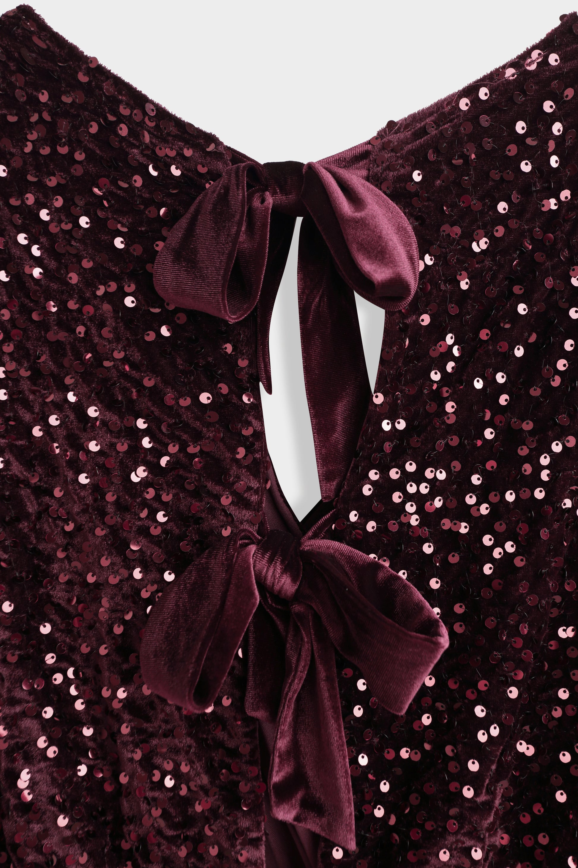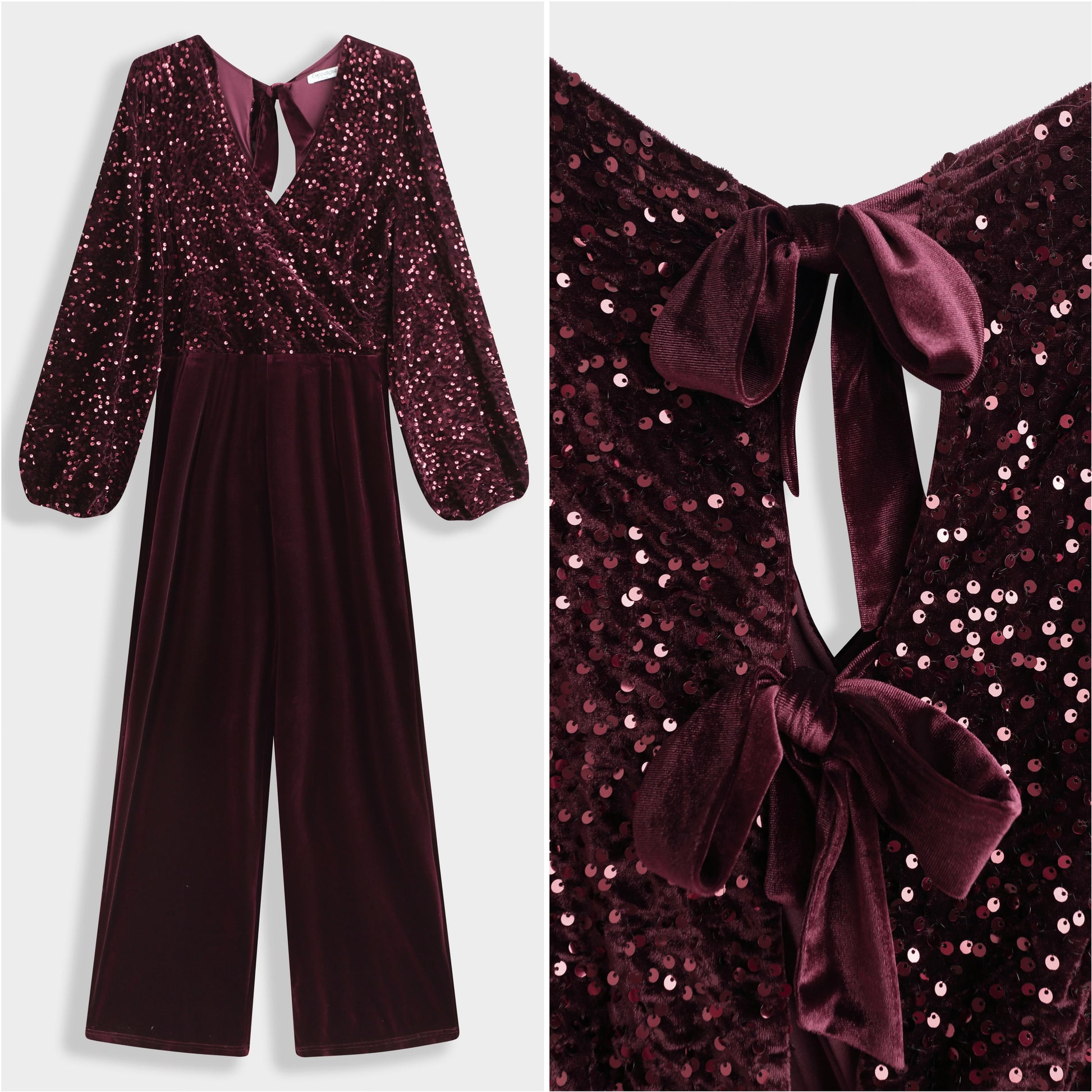 Elevate your style at any winter wedding or Christmas party with our Margot sequin and velvet burgundy jumpsuit. The luxurious velvet material adds a touch of elegance, while the sequin details add the perfect amount of sparkle. Stay both warm and fashionable this season in this must-have outfit.