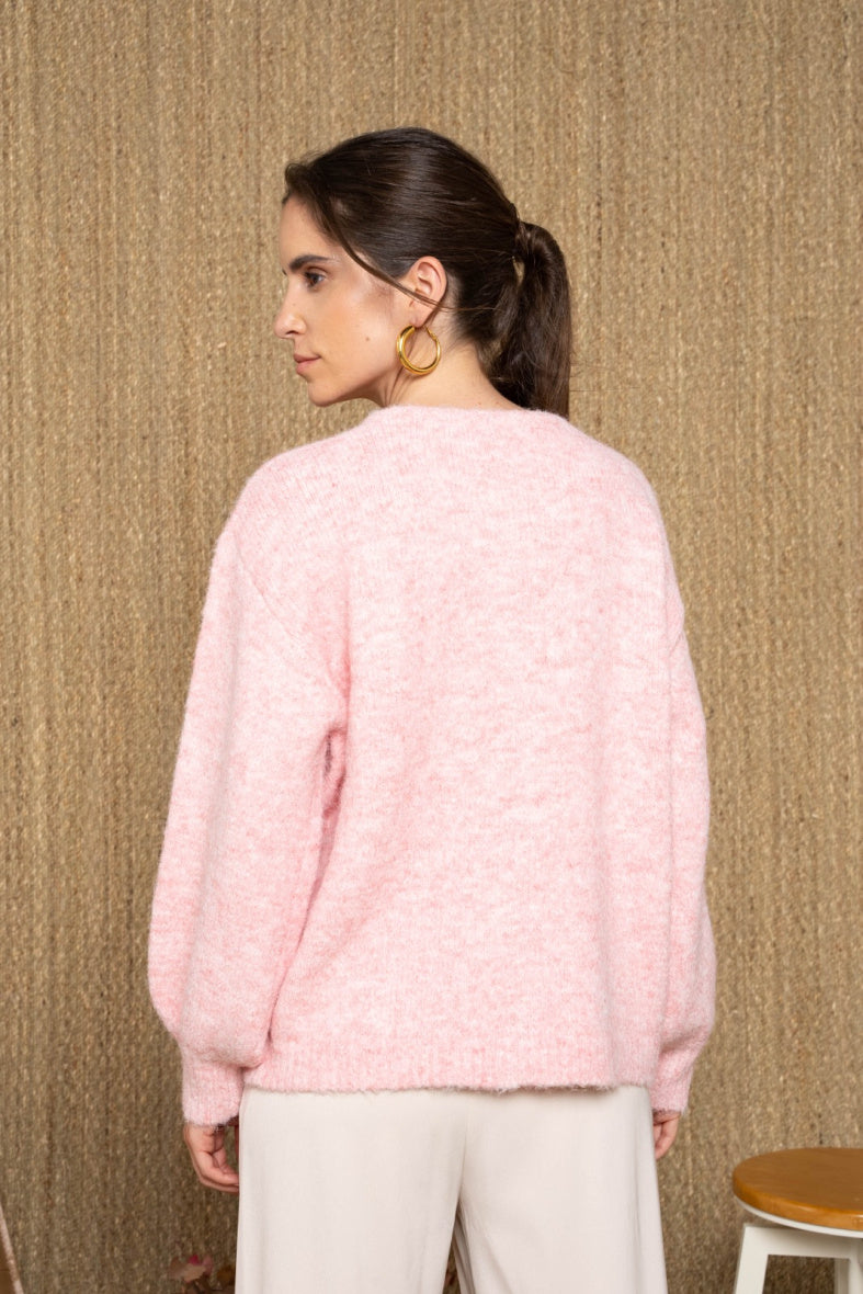 The Marie cardigan features a luxurious mix of 10% alpaca, 22% polyamide, 60% polyester, and 8% elastane, ensuring softness with resilient stretch. Designed to fit sizes 36 to 42, its pink base is elegantly accented by rainbow diamanté buttons, making it a statement piece that blends comfort with refined style.