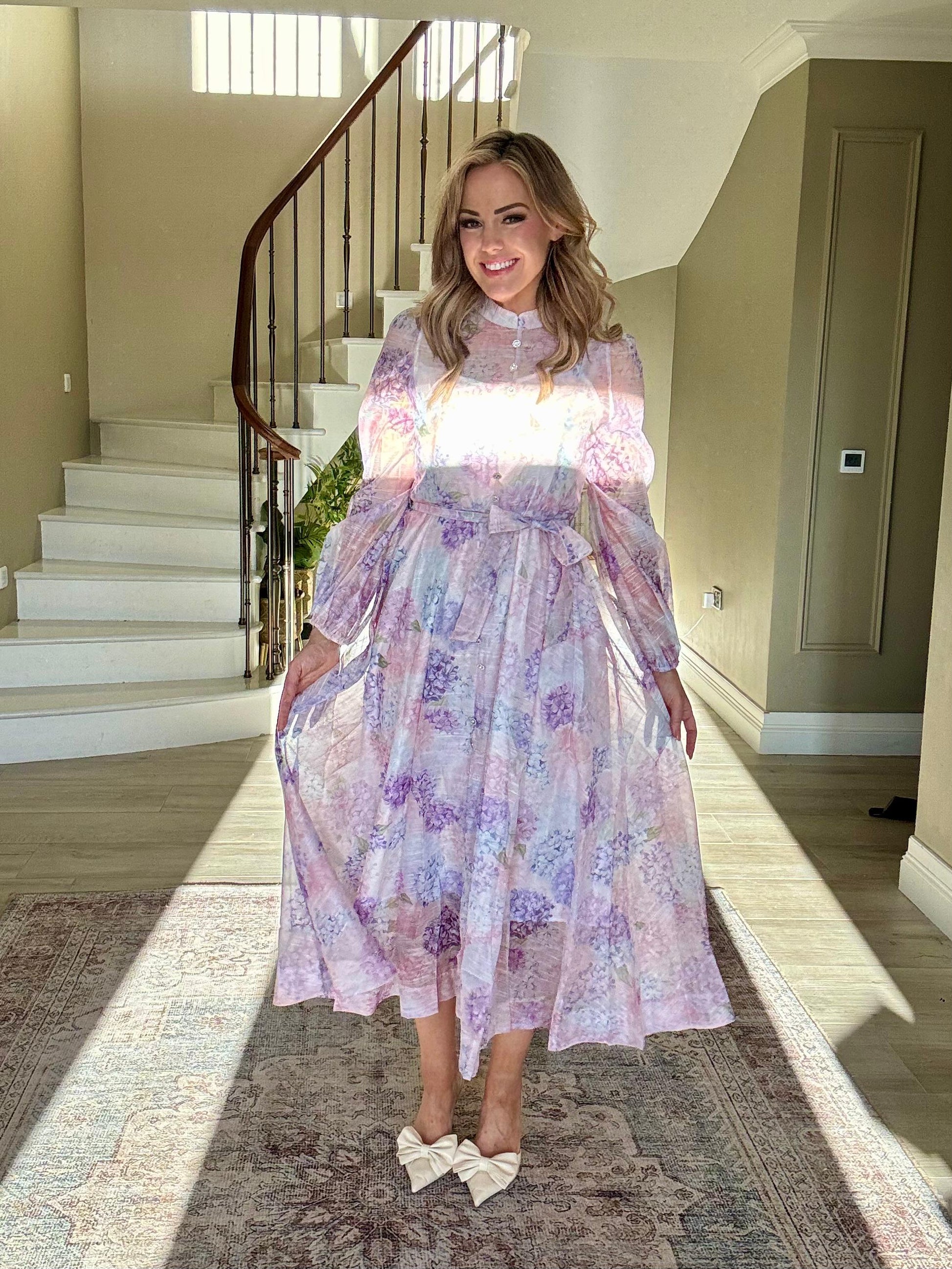 The Matilda hydrangeas purple maxi dress features a slip design with adjustable straps, ensuring a comfortable fit for various body types. It includes a discreet zipper at the back and practical pockets for added functionality. Available in sizes S/M (8-10) and M/L (12-14), the dress is true to size, accommodating diverse shapes effectively.
