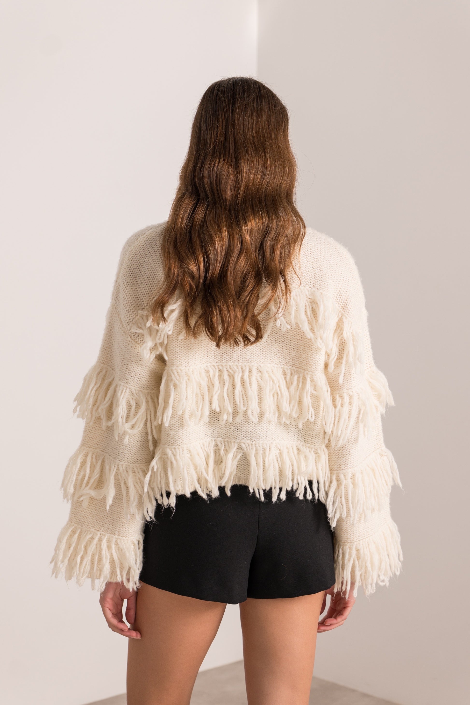 Expertly crafted from a blend of 64% polyamide, 35% wool, and 1% elastane, the Mia fringe cropped ivory jumper is the perfect combination of style and comfort. Its slightly cropped design is versatile and can fit sizes 8-14, making it a must-have for any wardrobe. Stay on trend with this chic and cozy addition to your closet.