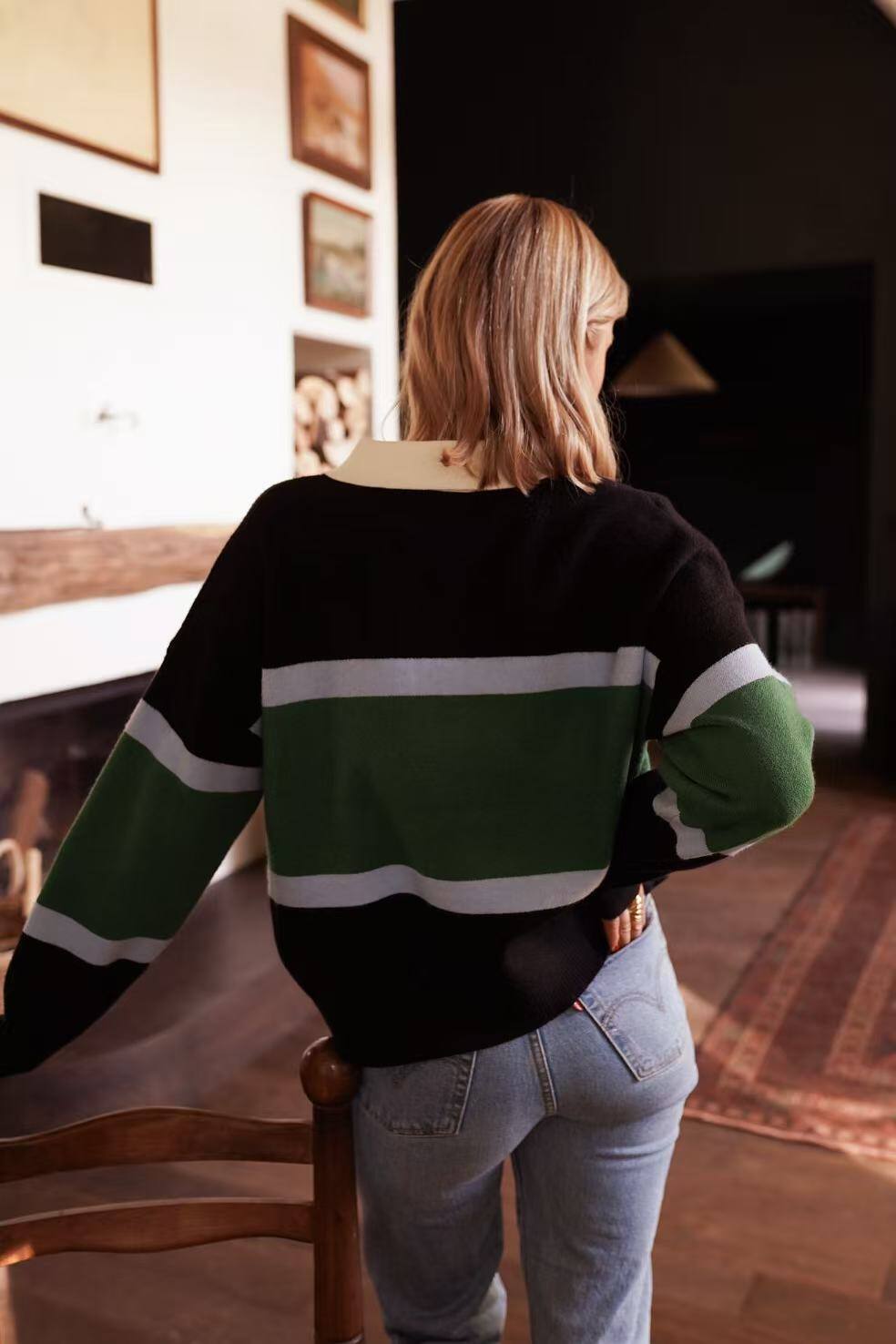 With its slightly oversized fit and long sleeves, it pairs perfectly with jeans or a skirt for an effortless and trendy style.