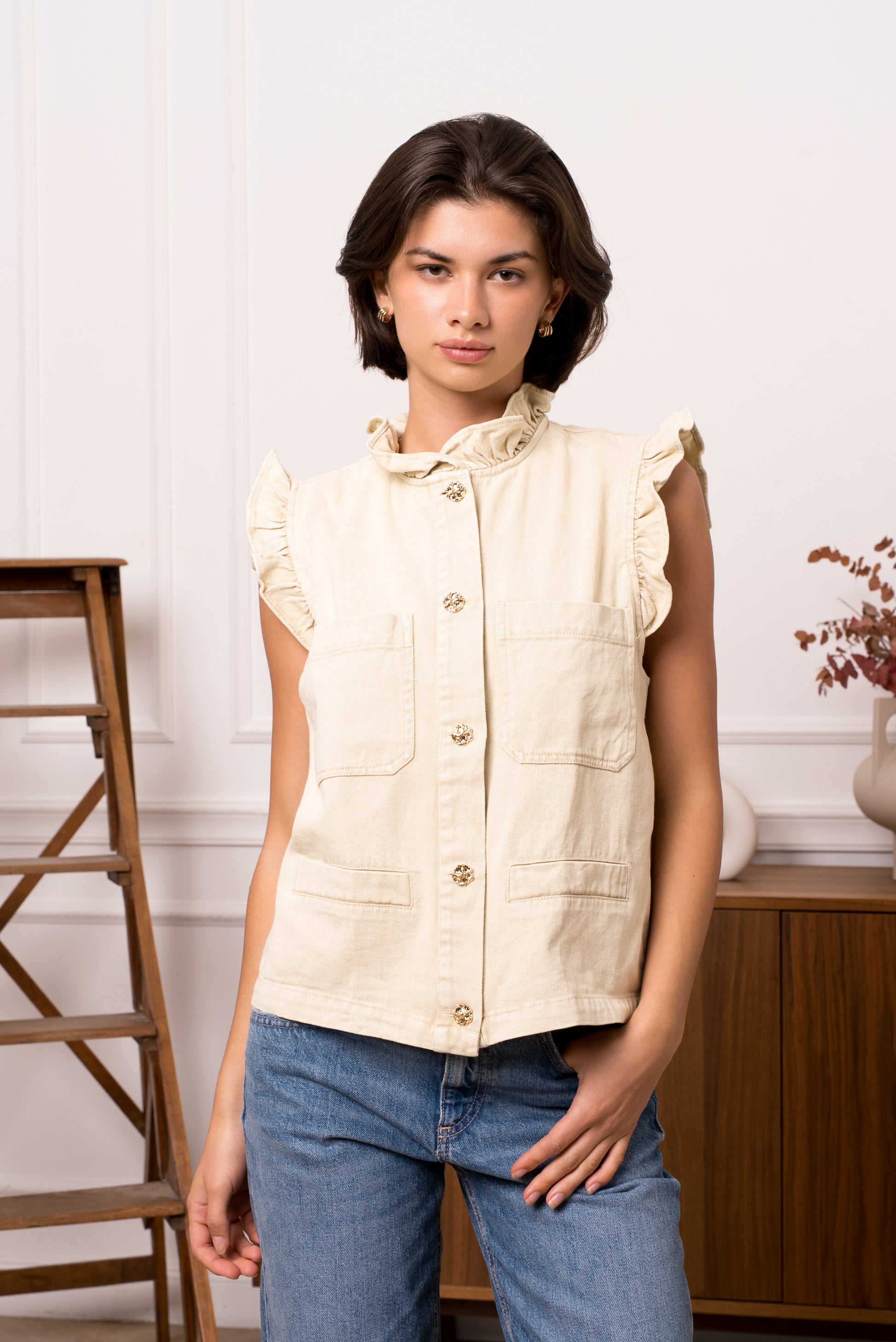 Expertly crafted from a soft ecru denim, the Molly sleeveless jacket is adorned with elegant gold buttons. This jacket is the perfect addition to any wardrobe, adding sophistication and style to any outfit. The frill sleeves add a feminine touch, making it a versatile piece for any occasion.