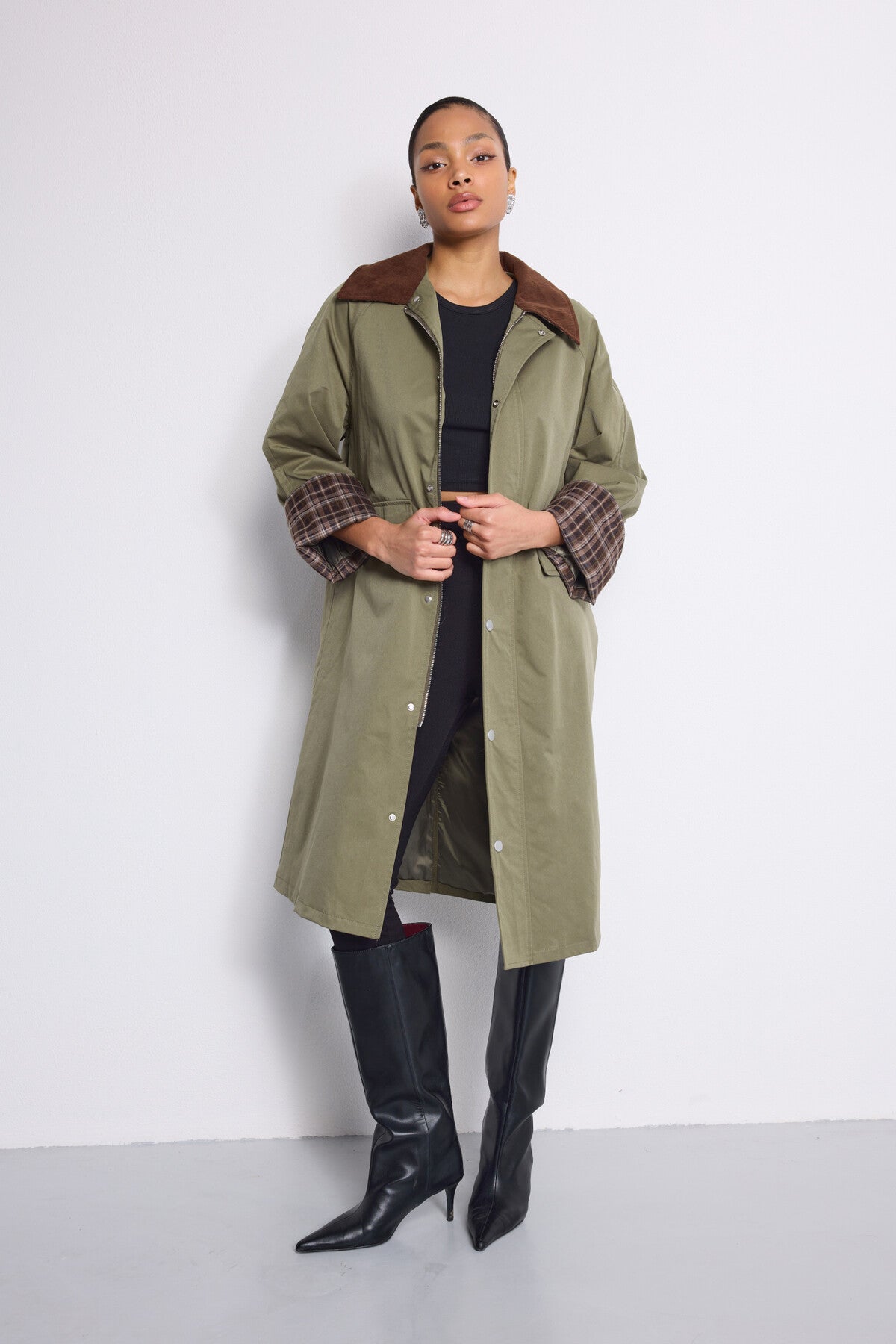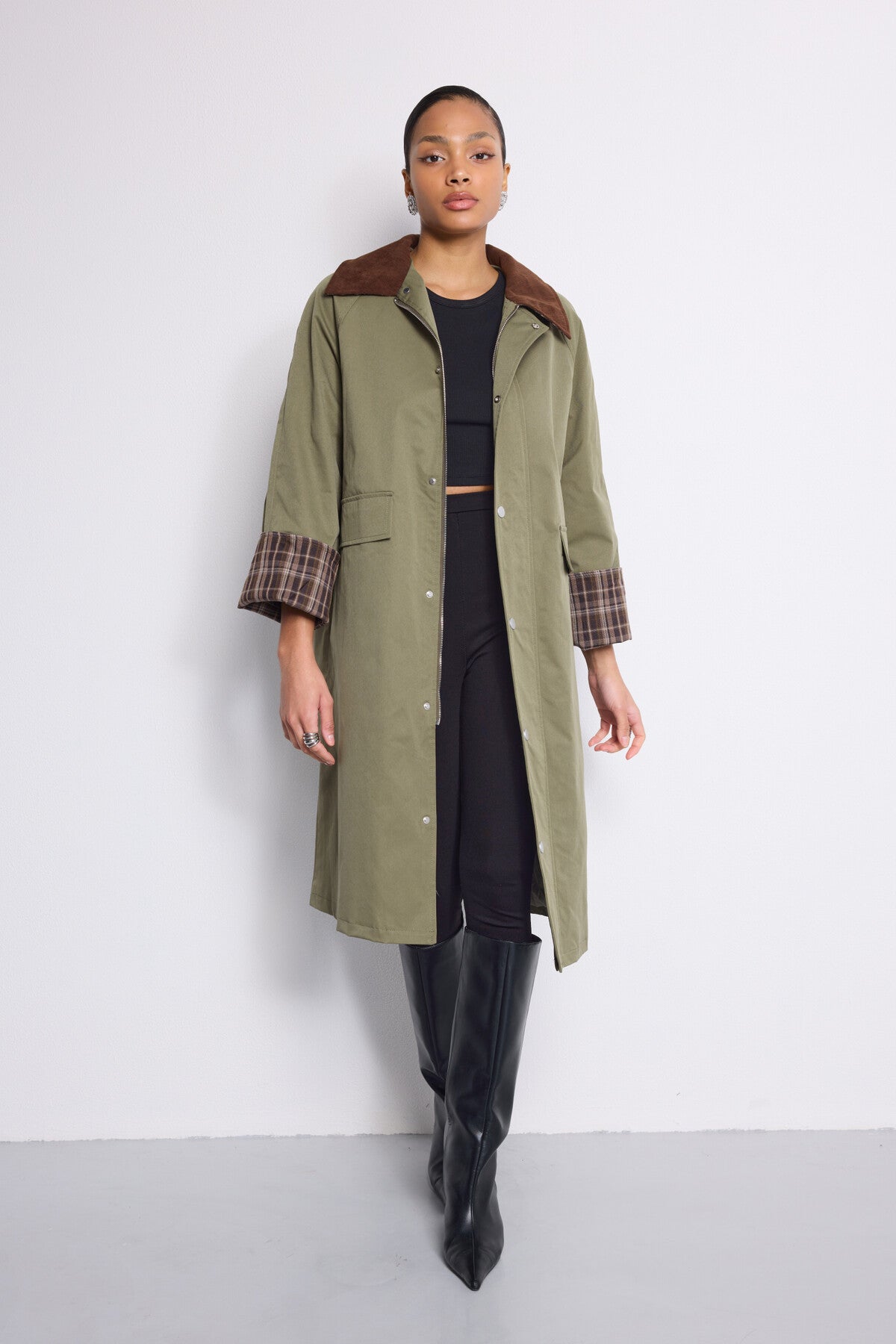 This Sadie barn cord collar khaki trench coat blends country chic style with practical design. Featuring a classic check print cuff, it adds a subtle pattern contrast to the timeless khaki trench silhouette. The cord collar enhances durability and comfort, making it a refined choice for outdoor wear with an expert touch.