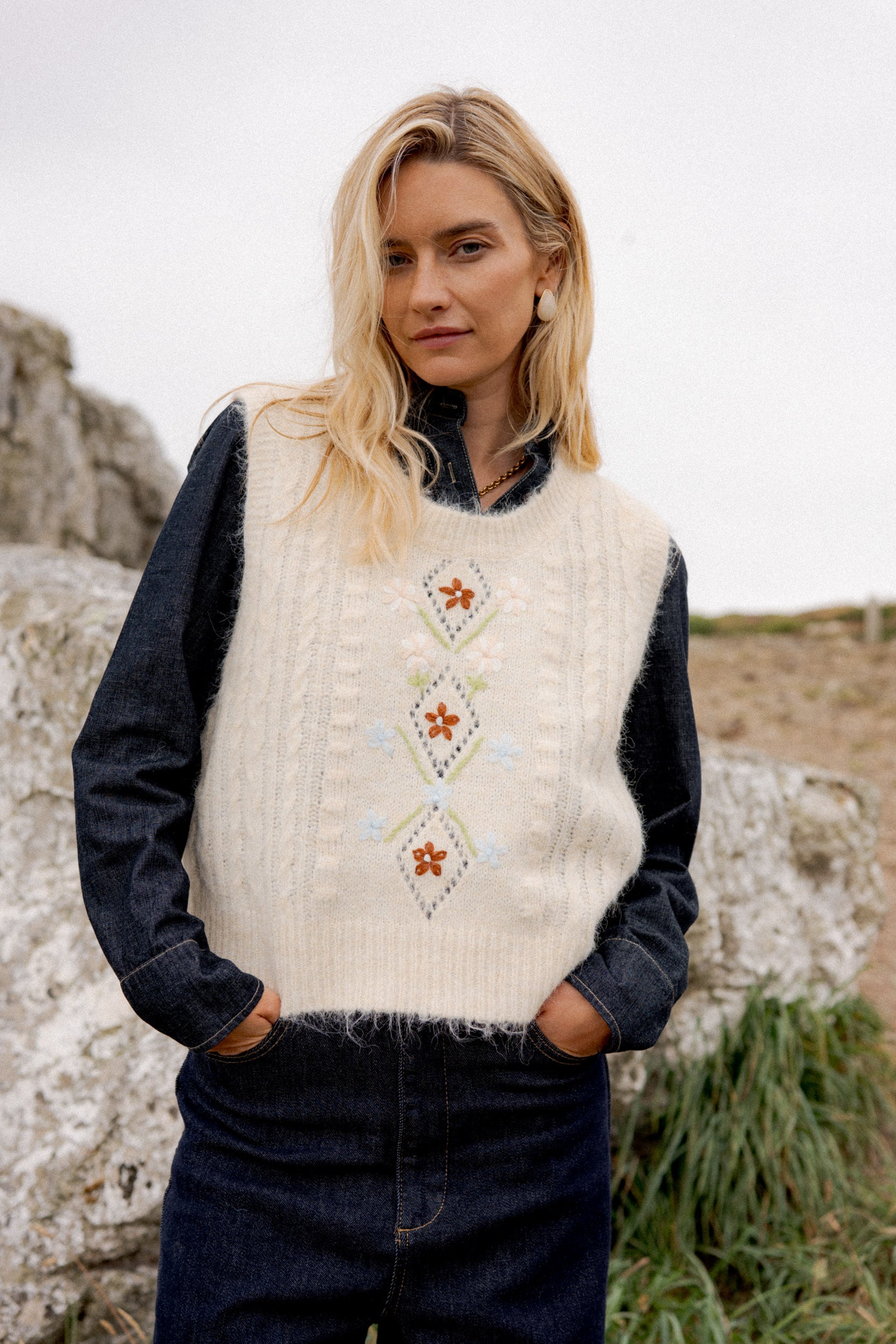 "The Saoirse sleeveless fluffy knit is a sustainable and stylish option for any fashion enthusiast. Made with 68% recycled polyester, 20% polyamide, and 12% wool, this cozy top features delicate floral embroidery, perfect for achieving the popular cottage core aesthetic. Stay fashionable while helping the environment with this versatile and unique piece."