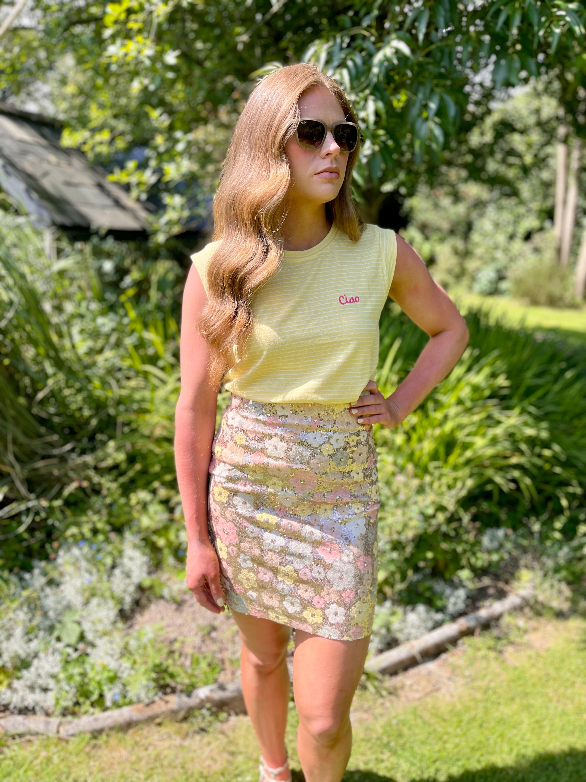 Elevate your style with the Sara floral sequin mini skirt, designed to catch the light and attention. Perfectly paired with a simple cami top or blouse, this skirt adds a touch of sparkle while maintaining a balanced, sophisticated look. Ideal for both day and evening wear, it offers a chic way to introduce shimmer without overwhelming your outfit.