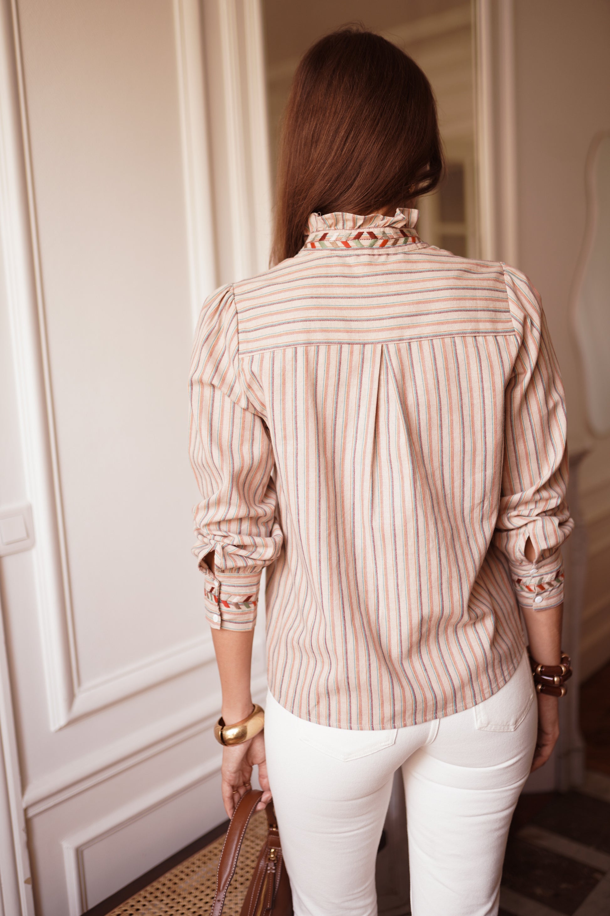 Elevate your wardrobe with our Taylor blouse. Featuring pinched shoulders and a frill collar, this cotton blouse is both stylish and comfortable. The floral embroidery on the striped fabric adds a touch of sophistication. Its true size fit ensures a flattering look. Perfect for any occasion.