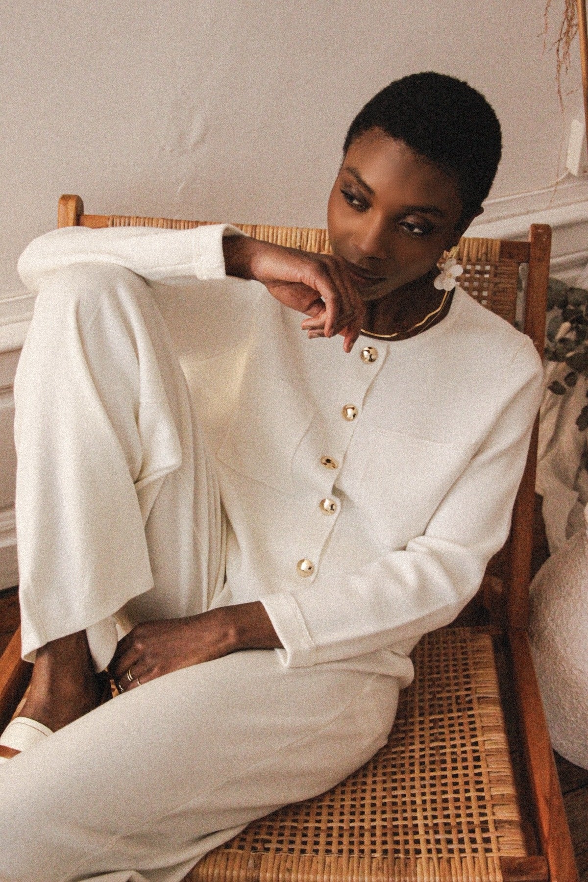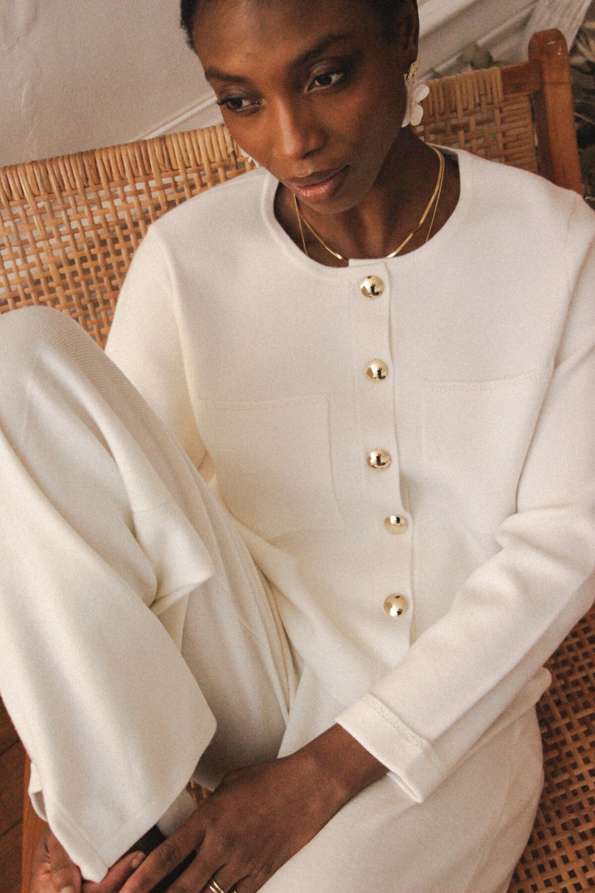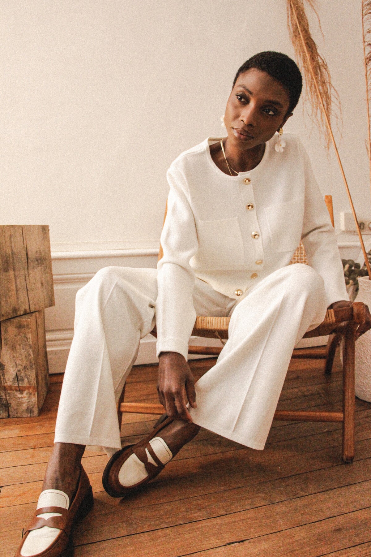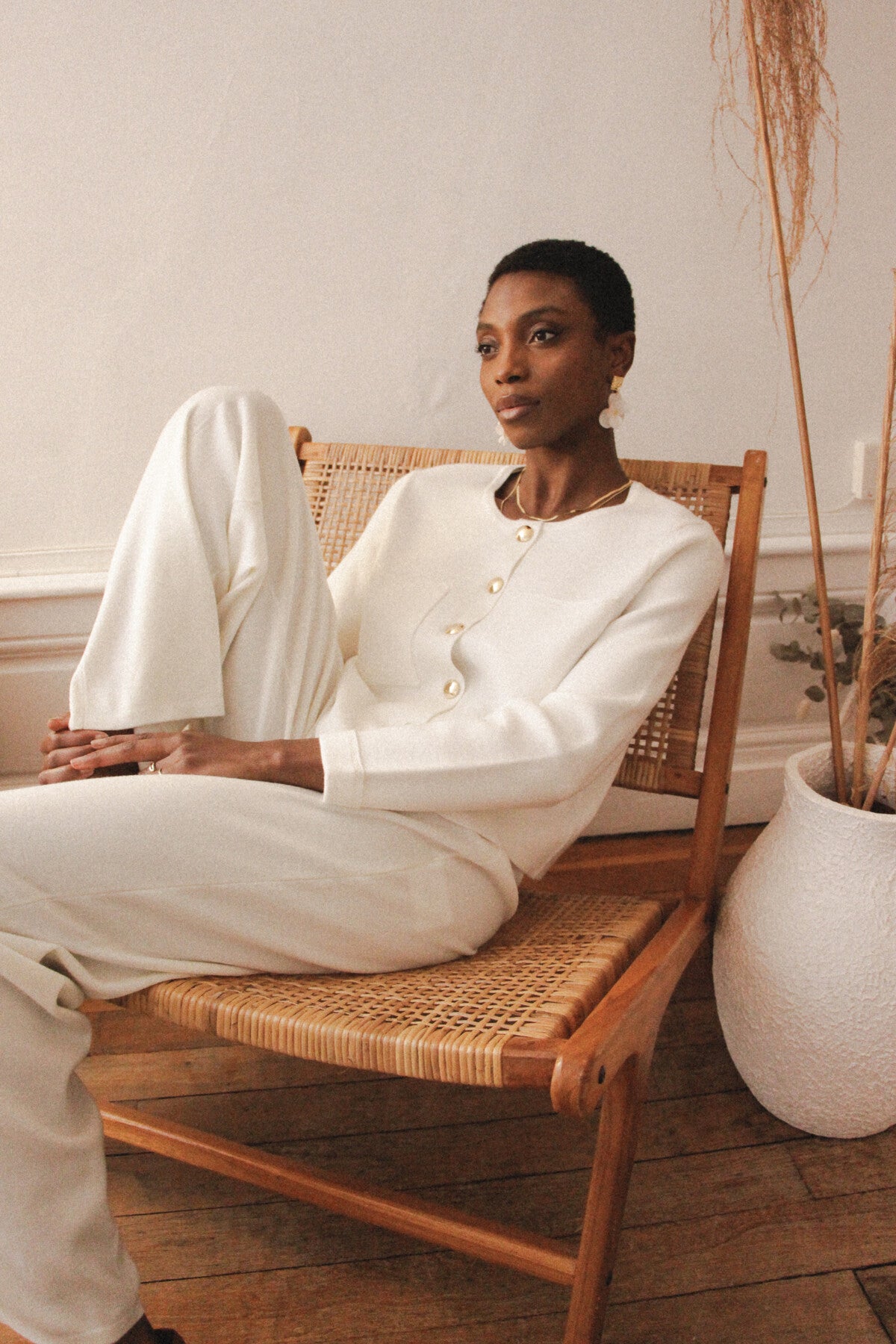 Short mixed wool jacket with long sleeves. Round neckline. Chest pockets. Crochet finish on pockets and sleeve ends. Length from shoulder: 53 cm for size S ⁄ M. The model is 1.76m tall and wears size S ⁄ M.