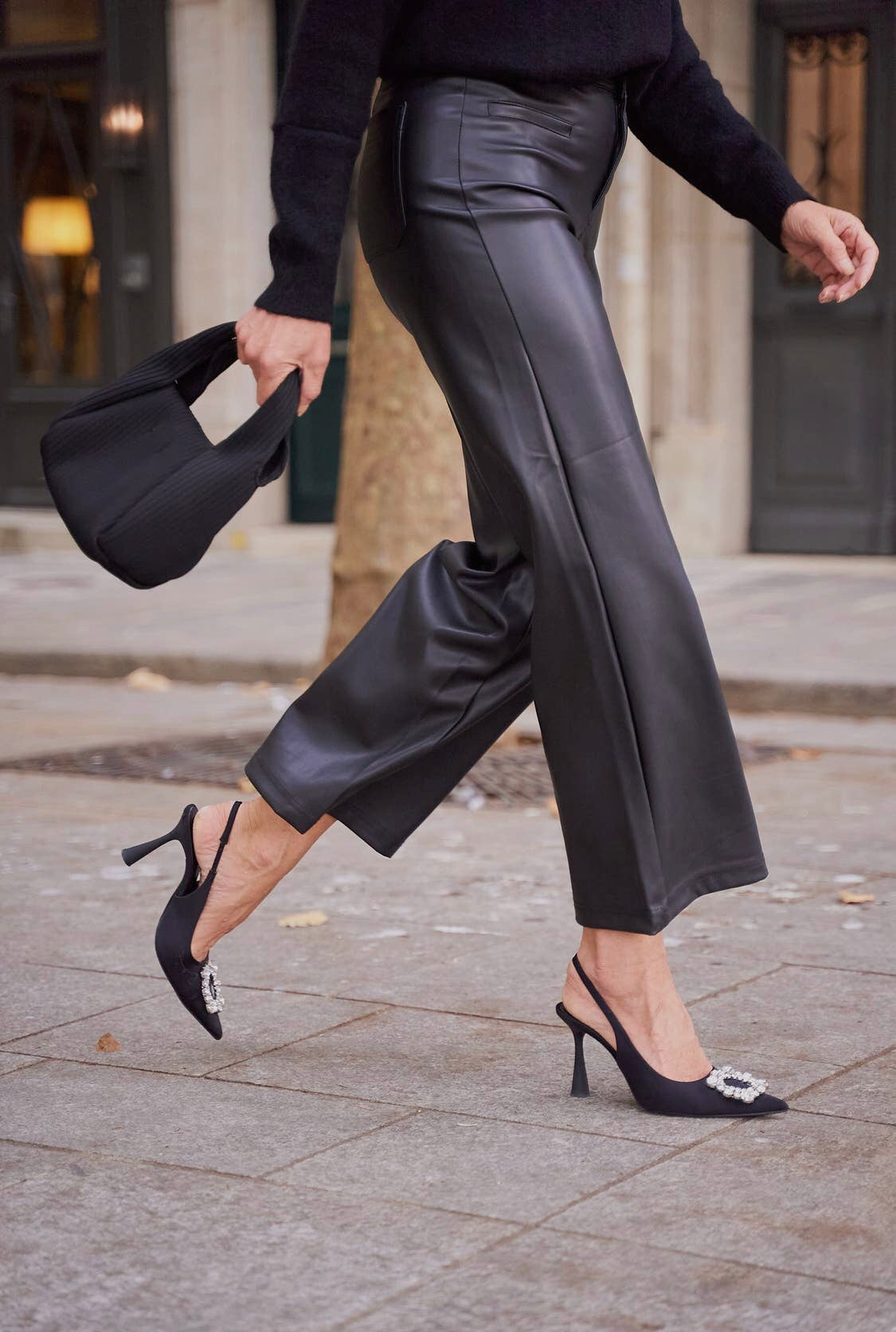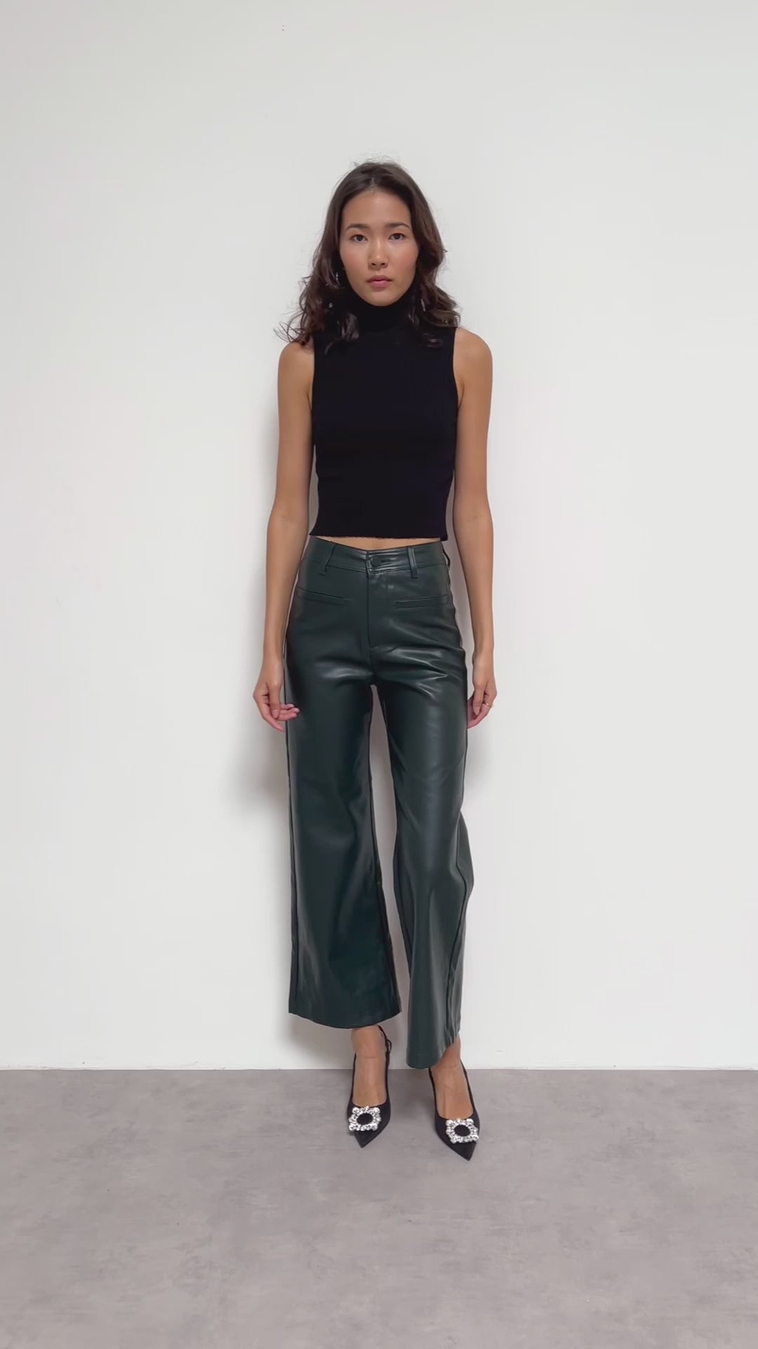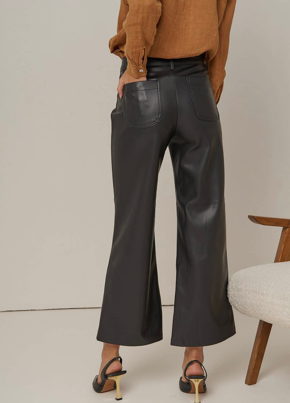The Valentine faux leather pants are wide leg pants. This cut flares out from the hips to give a retro look to your outfits.