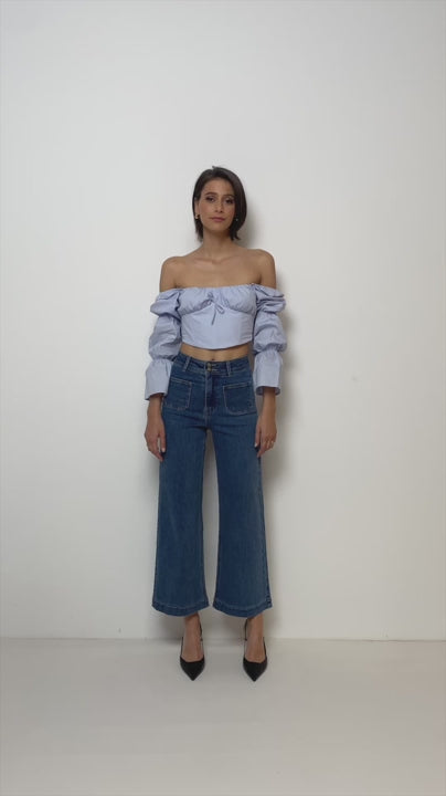Wide leg blue jeans with front pockets