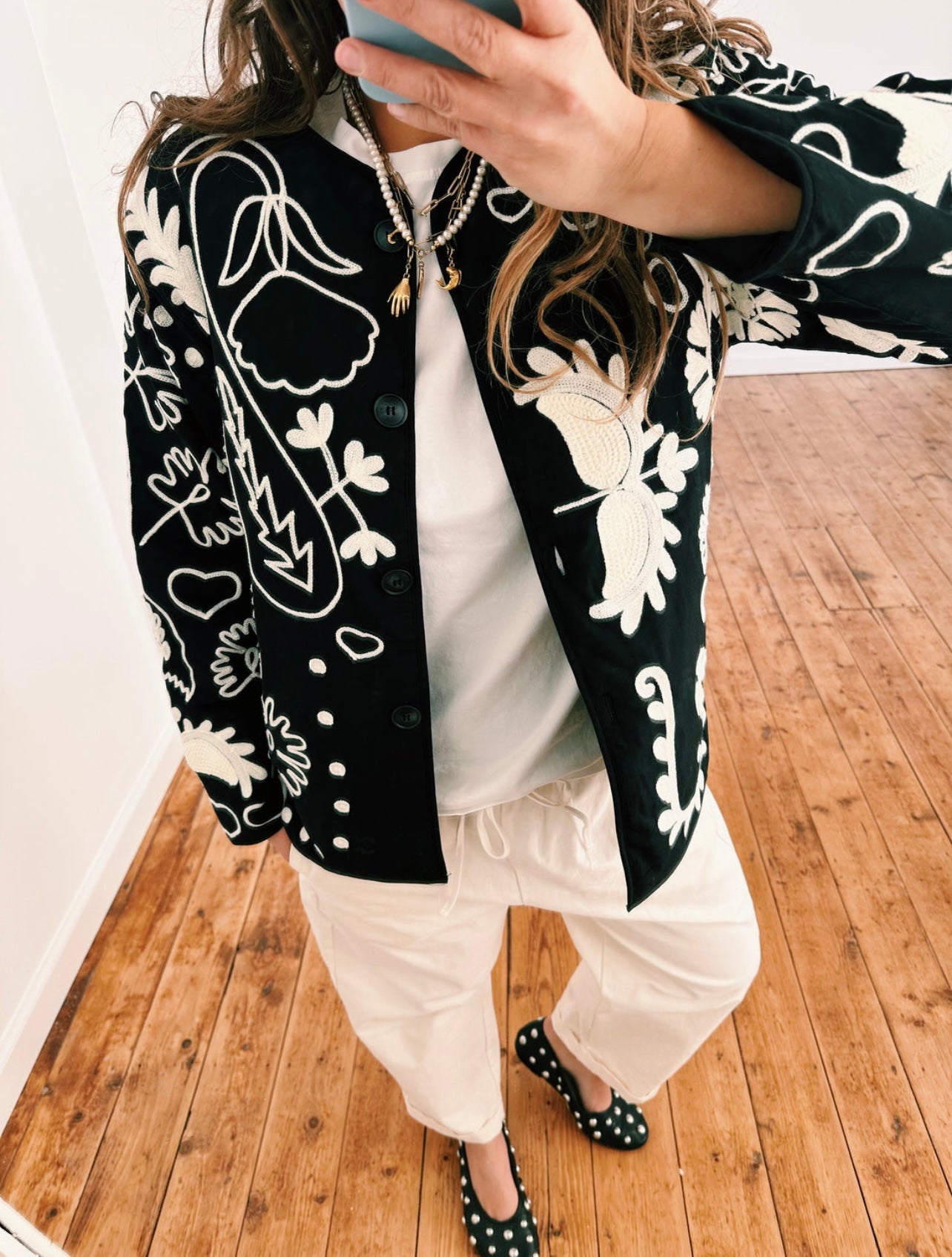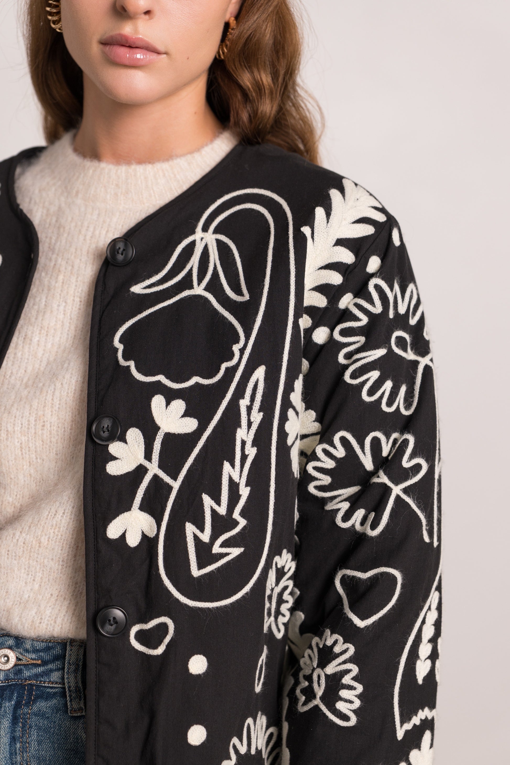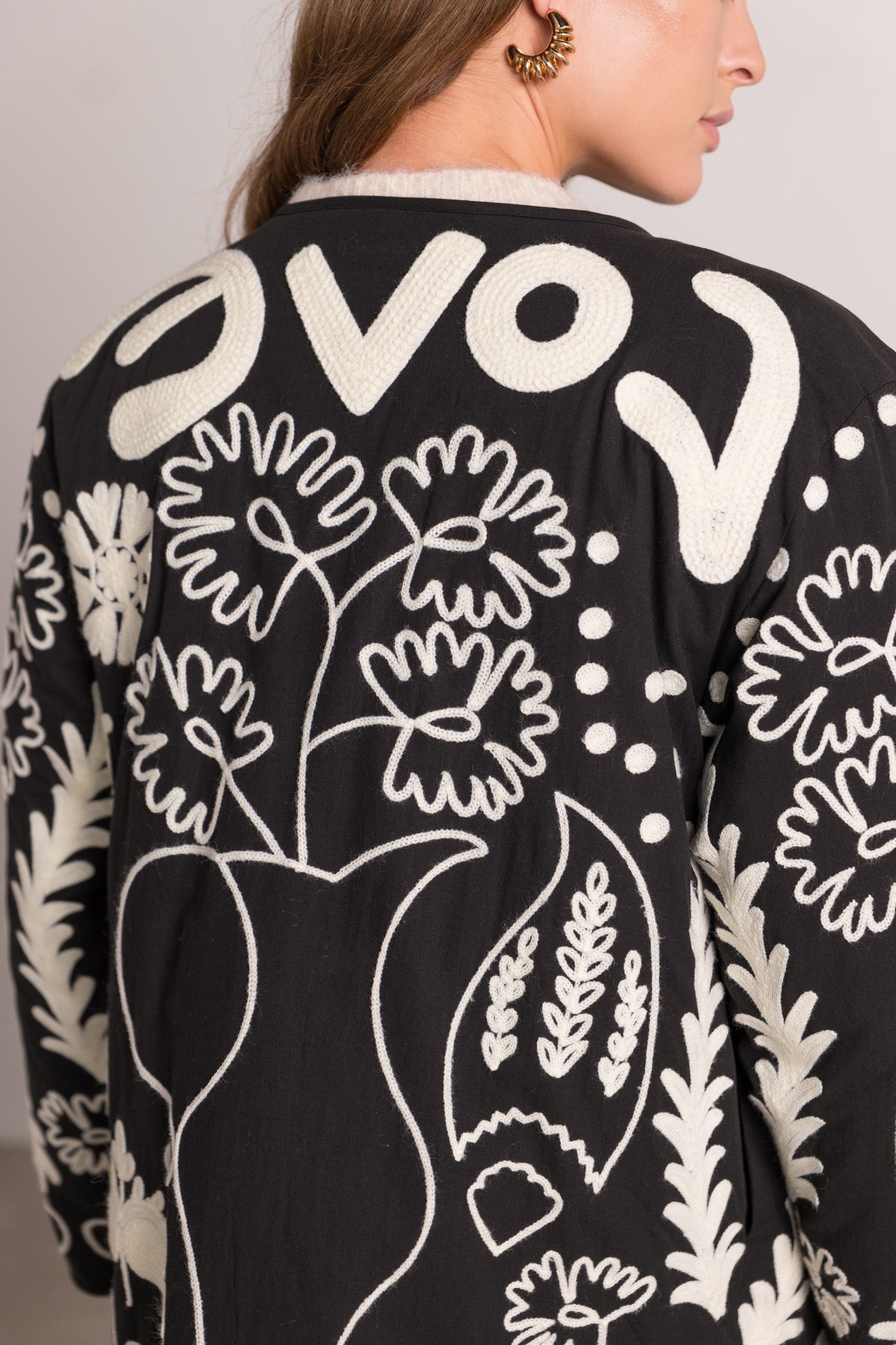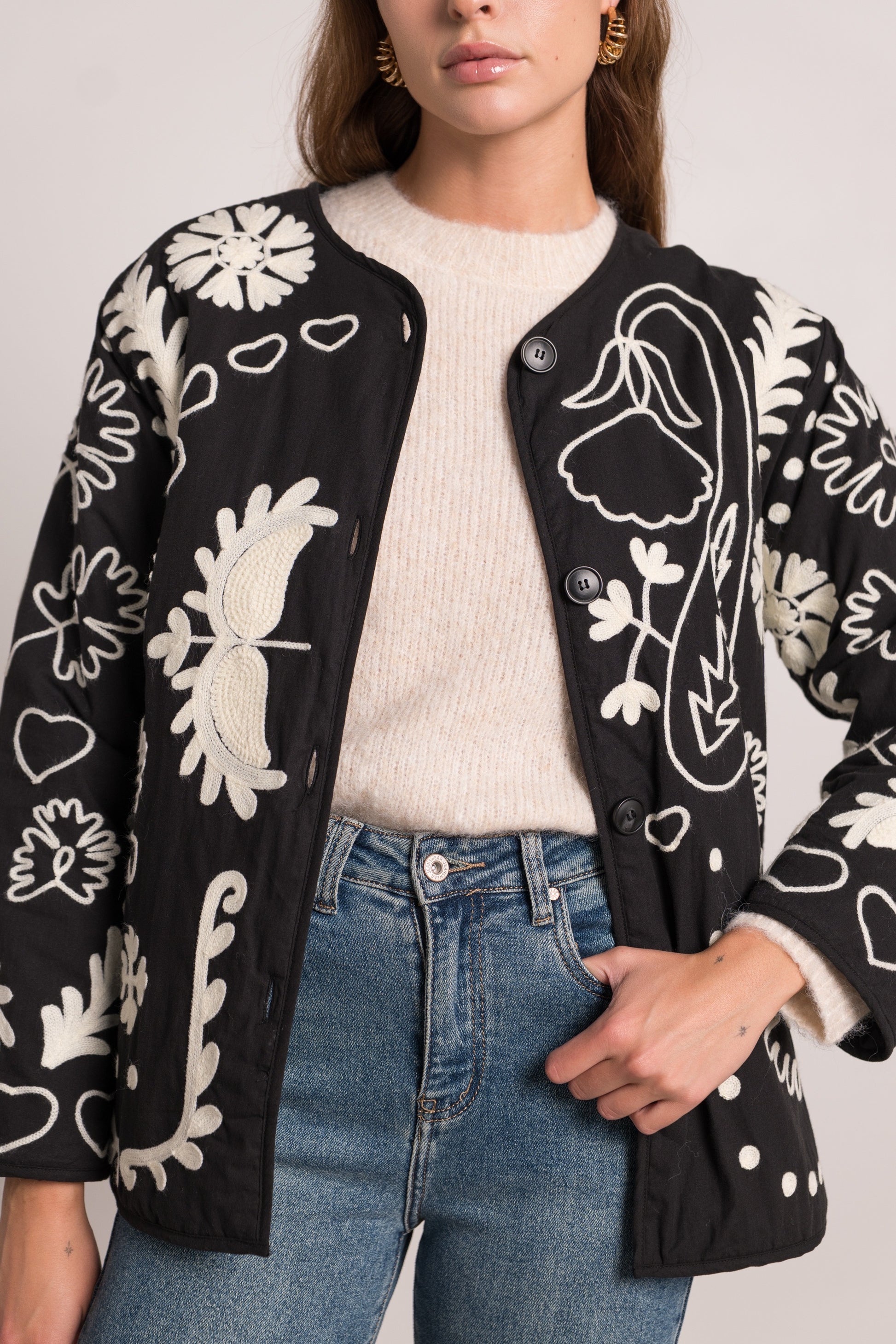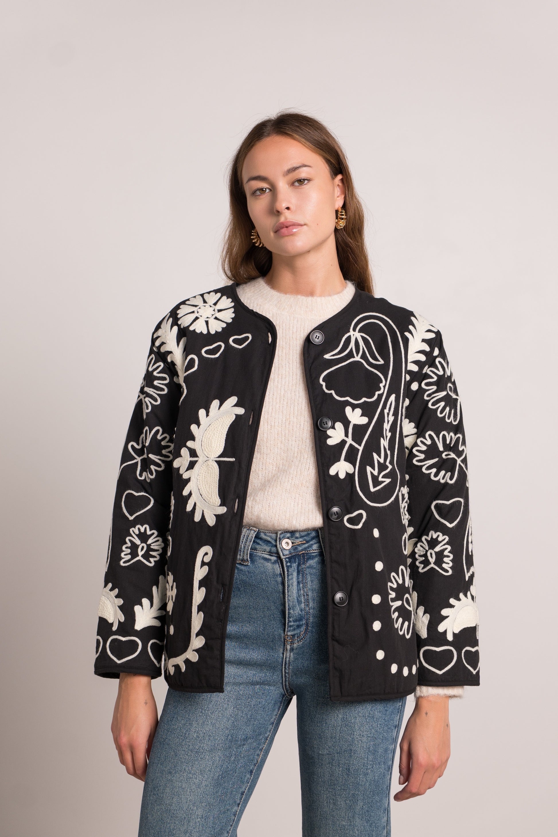This Willow black quilted love jacket is a statement piece made from 100% cotton. With its quilted design, it offers both style and comfort. Perfect for any occasion, this jacket showcases your love for fashion and quality materials.