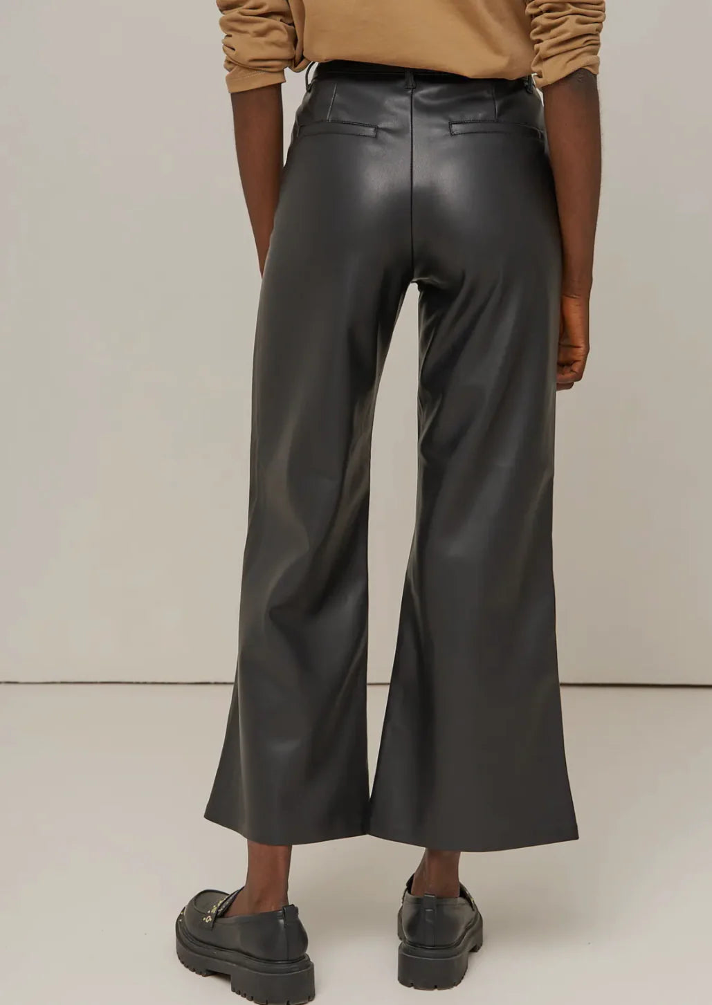 These faux leather pants are wide leg pants. This cut flares out from the hips to give a retro look to your outfits.