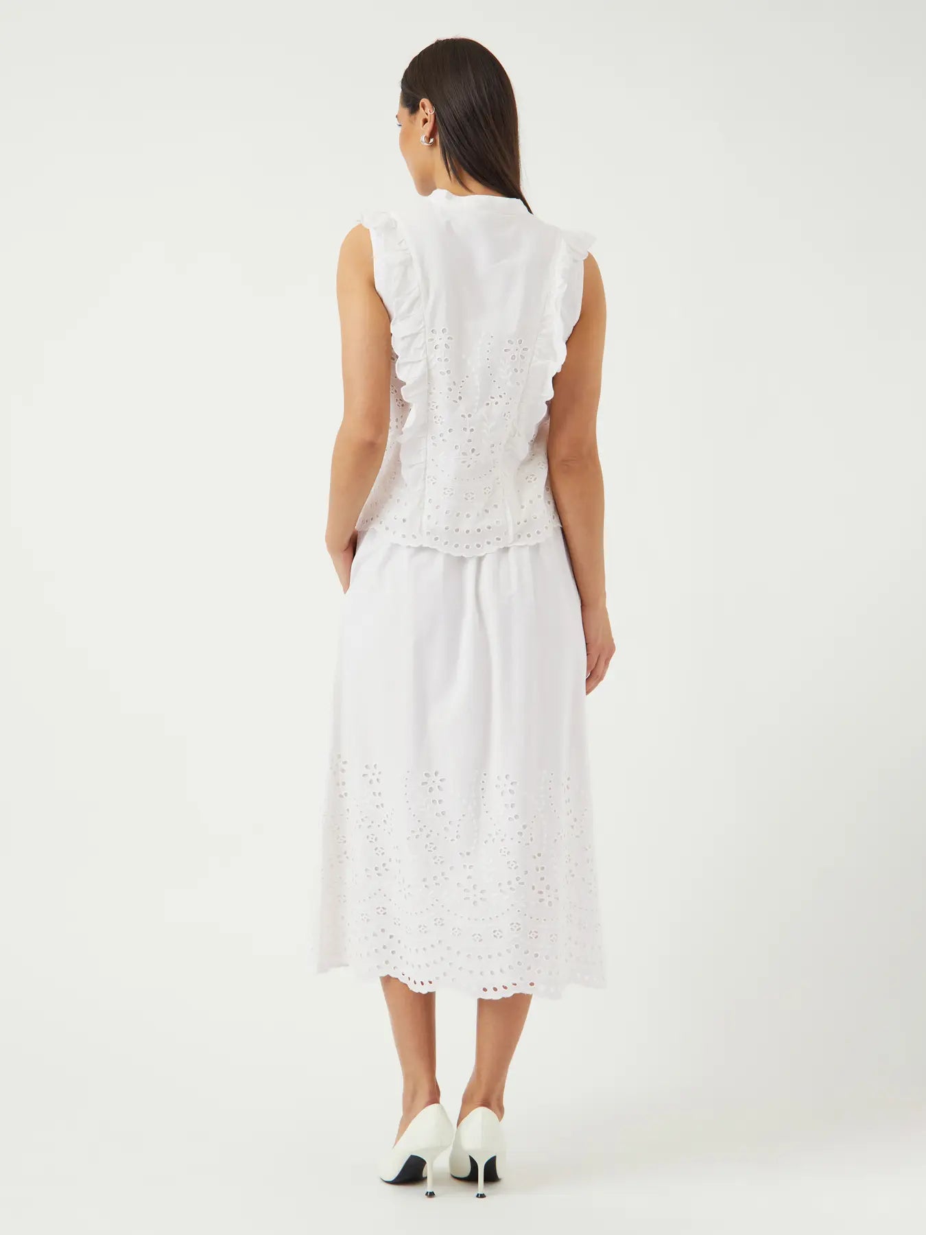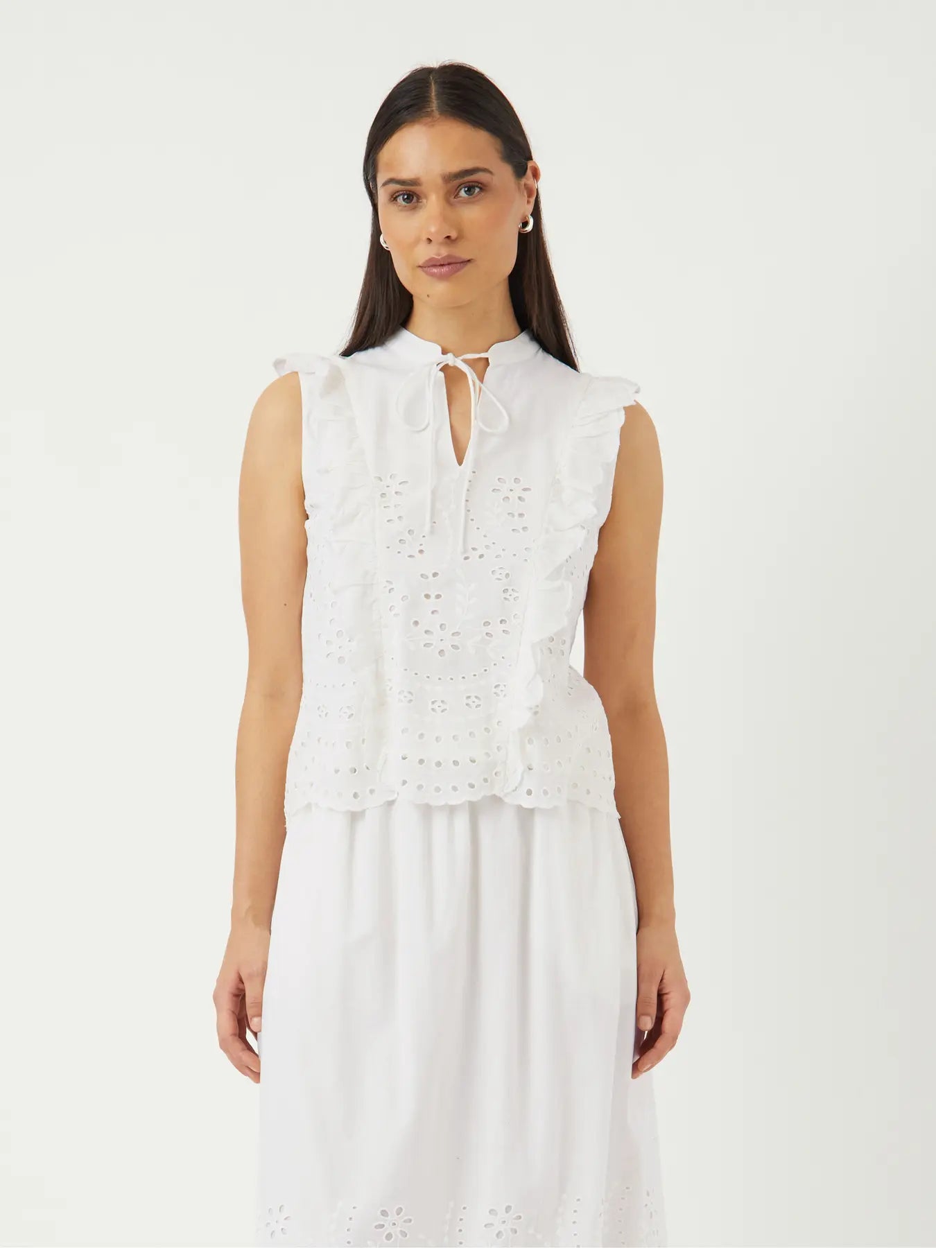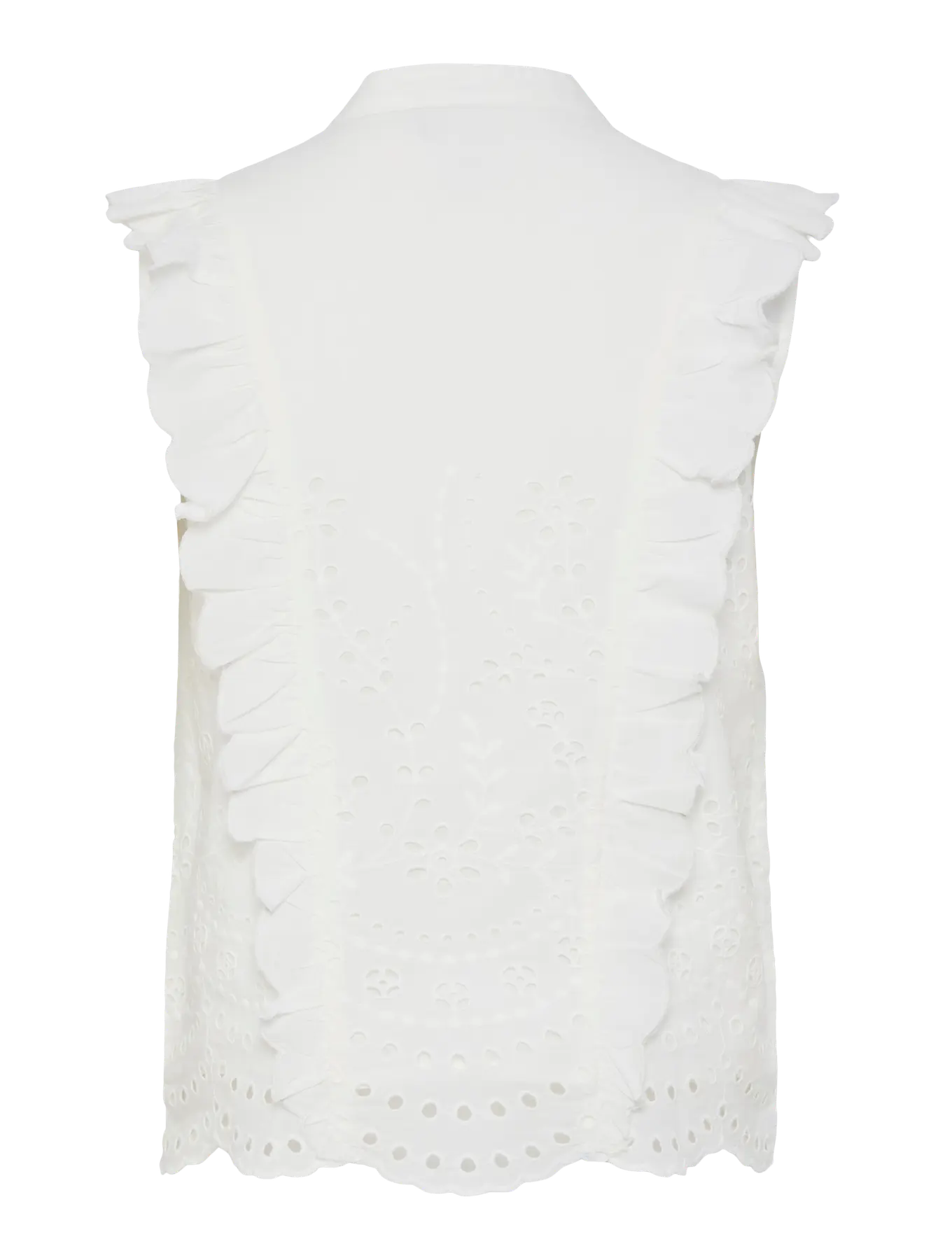 YAS star white sleeveless embroidered blouse featuring delicate cotton ties at the neck for adjustable styling versatility. The embroidered detailing adds refined texture and visual interest to this essential wardrobe piece. Crafted for a polished, professional aesthetic, this blouse transitions effortlessly from office to evening wear. The sleeveless silhouette offers breathability and pairs beautifully with blazers, cardigans, or layered pieces. Perfect for those seeking understated elegance with thoughtful design details.