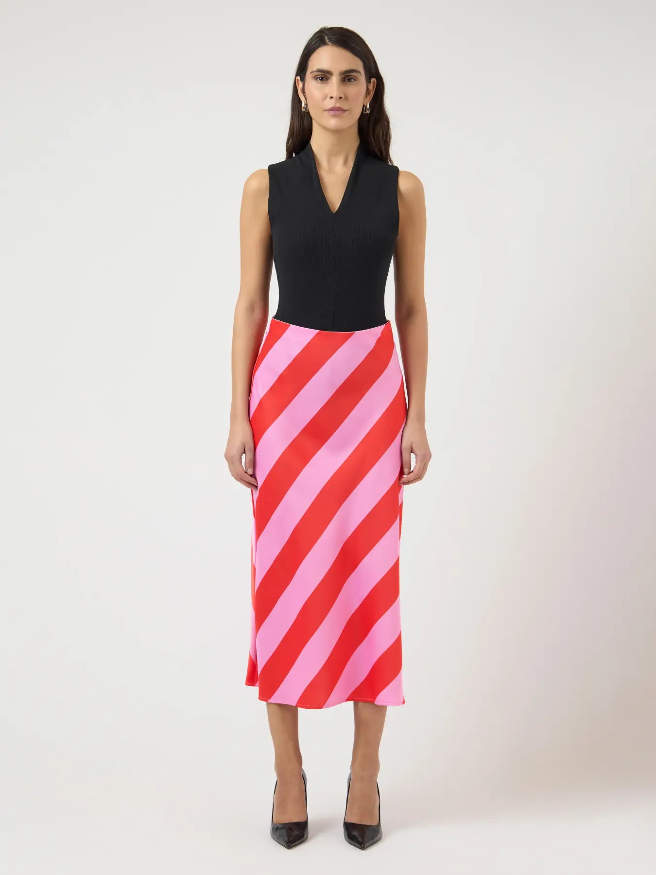 YASPELLA midi satin red and pink striped skirt