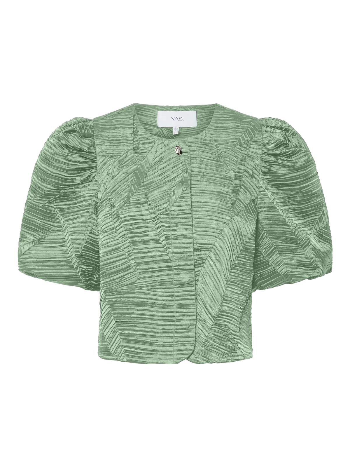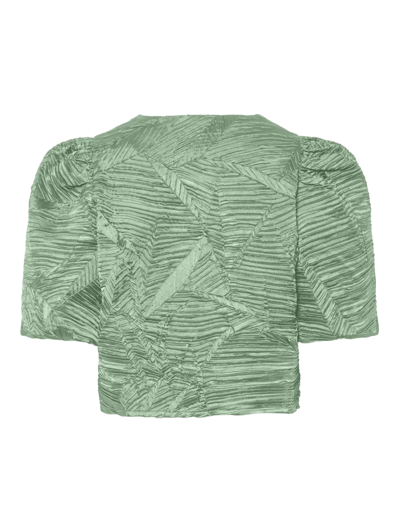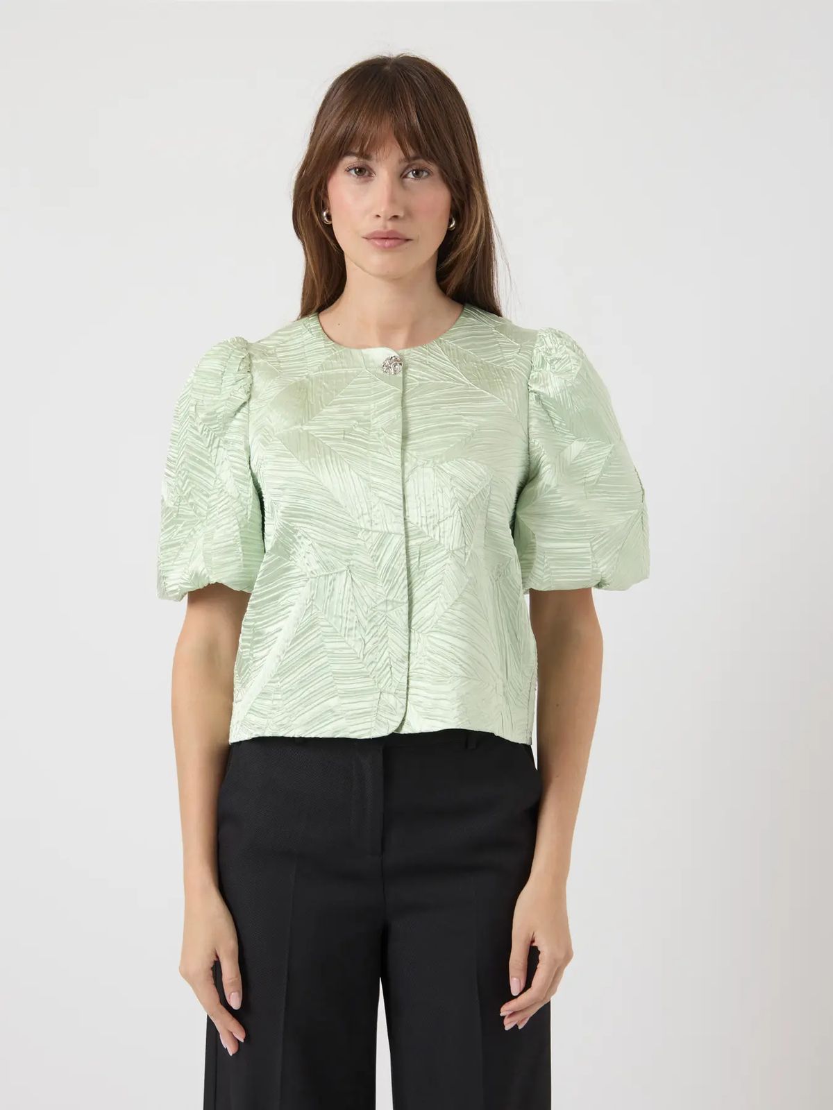 Elevate your wardrobe with the Yasvibe Leaf Print Puff Sleeve Top in light sage green. Featuring a delicate leaf pattern and silver top button, this blouse combines subtle elegance with modern charm. Designed with separate hidden closures, it ensures a clean silhouette while offering easy wear. The puff sleeves add a touch of sophistication, making it ideal for both professional and casual settings. Crafted to blend style and comfort seamlessly.