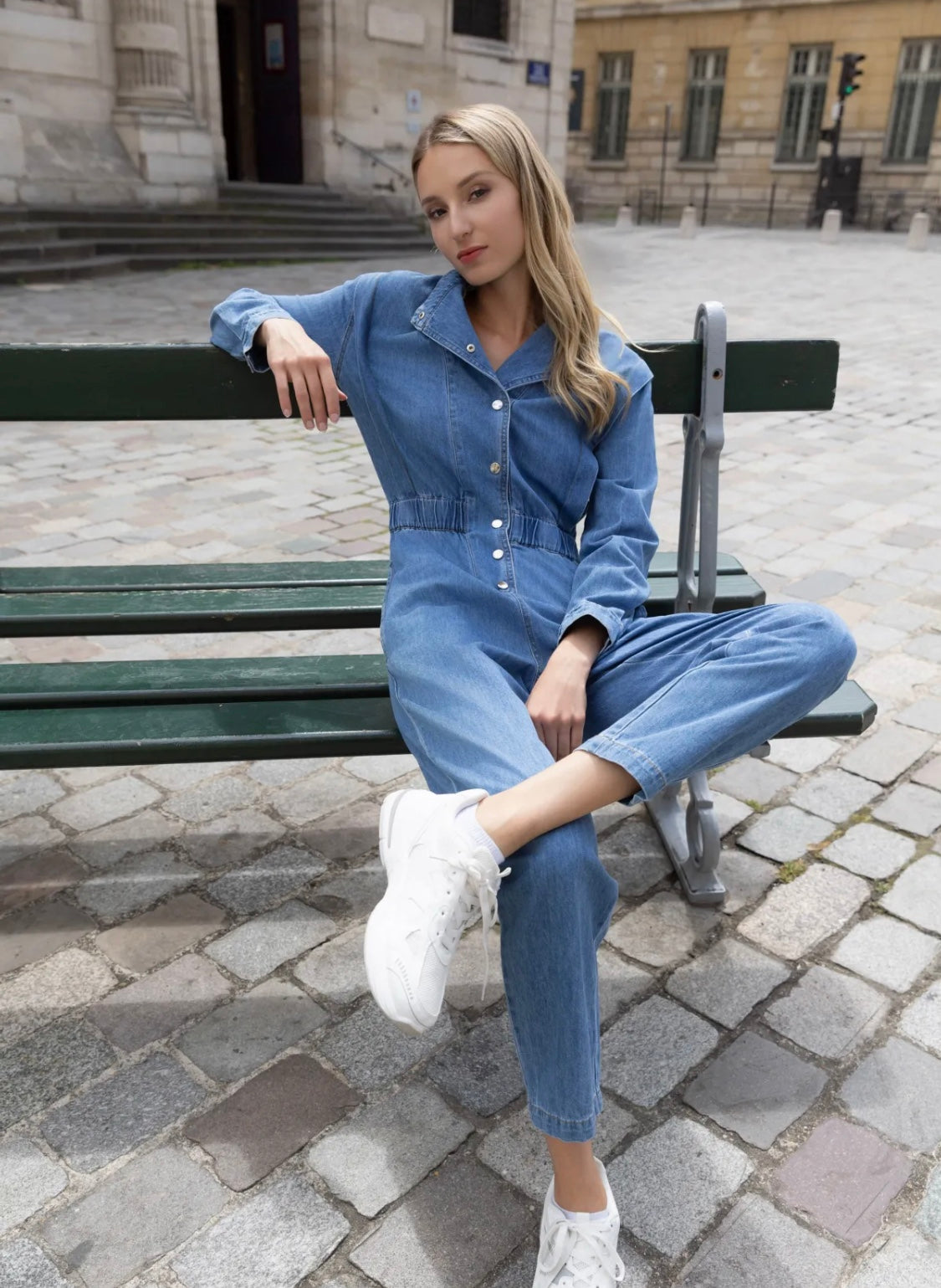 Faded jumpsuit with buttoning on the front. Dropped sleeves with a small cap sleeve.